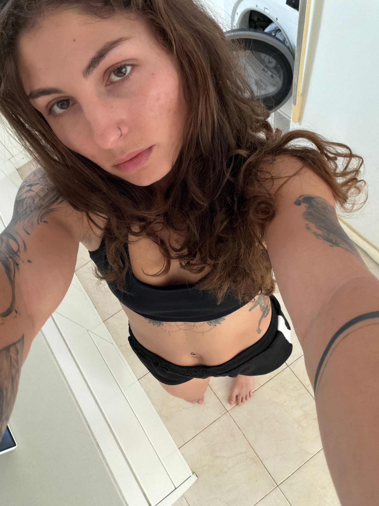A woman with brown hair, visible tattoos on her arms and torso, and a nose ring is positioned indoors, possibly in a laundry room or utility area. She is wearing a black top and shorts. A washing machβ¦read more