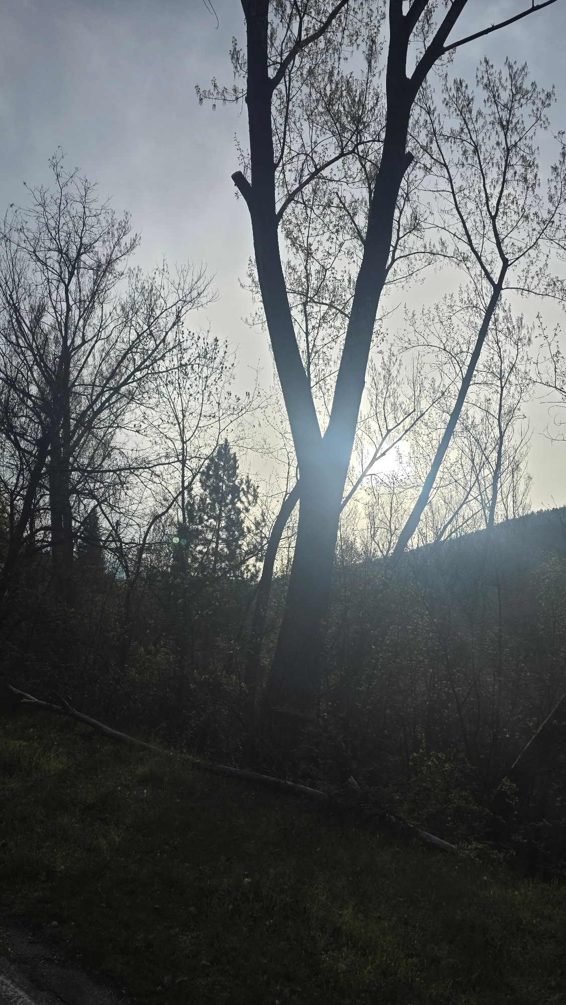 The image depicts a natural scene with a view looking up through bare tree branches towards a bright sky, possibly the sun. The trees are silhouetted against the light, and dense foliage or forest gro…read more
