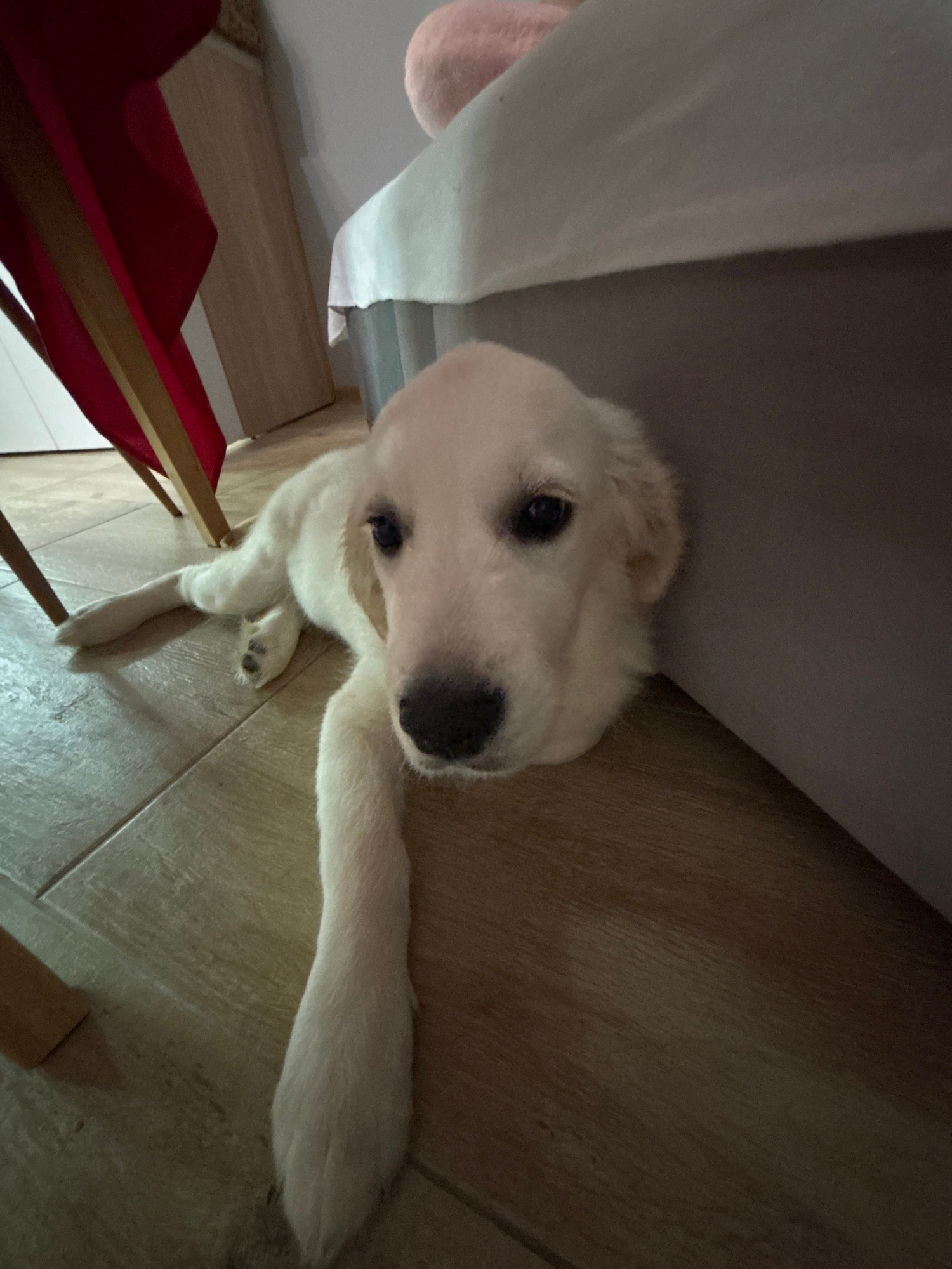 A light-colored puppy looks upward toward the camera. Its body is mostly underneath a light-colored bed. The dog is on a wood floor. A red chair is partially visible in the lower left corner of the im…read more