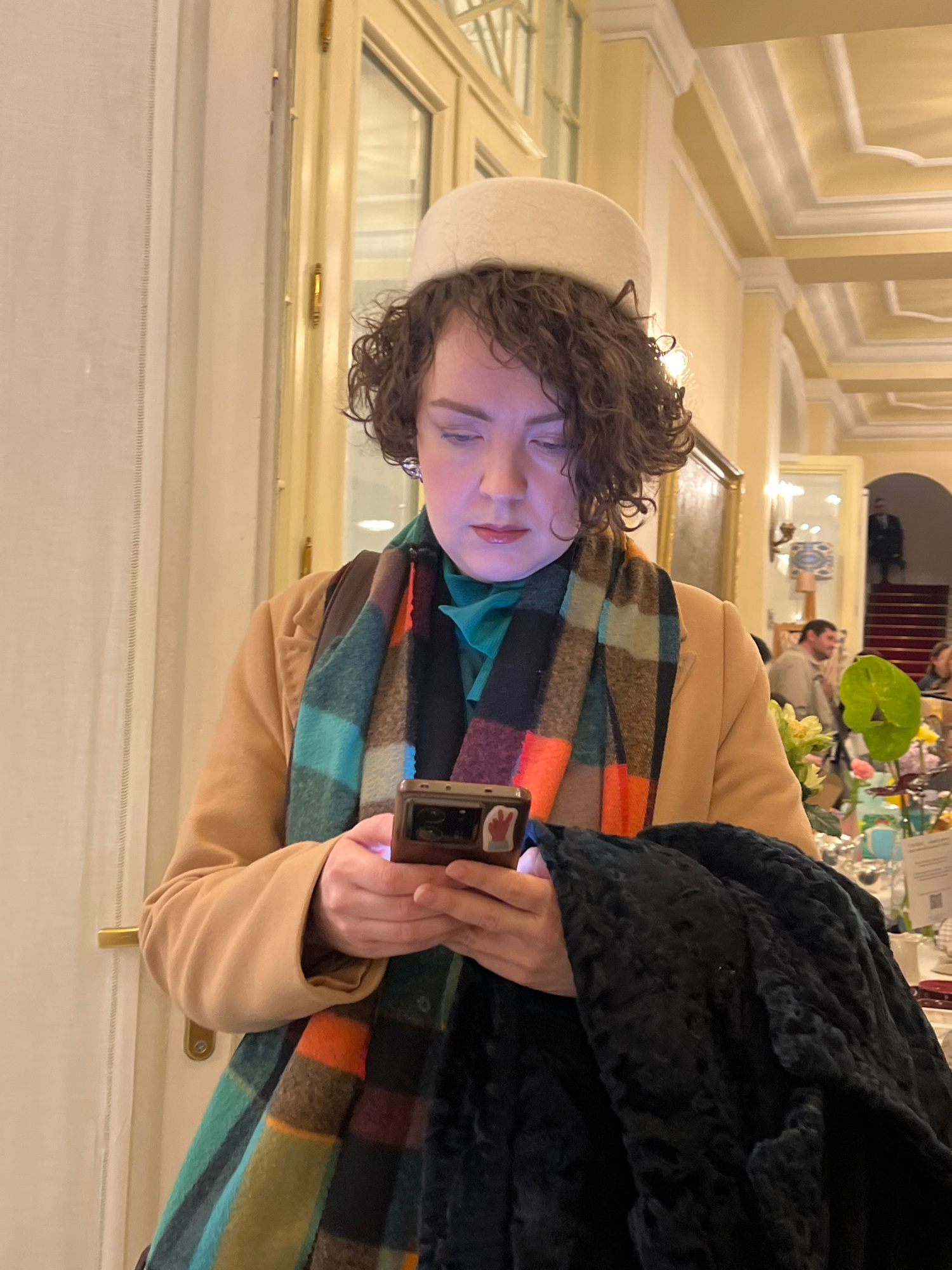 A woman is shown in an indoor setting. She wears a white hat, a tan jacket, and a multi-colored scarf. She is using a smartphone. The setting appears to be an ornate interior with decorative ceilings…read more
