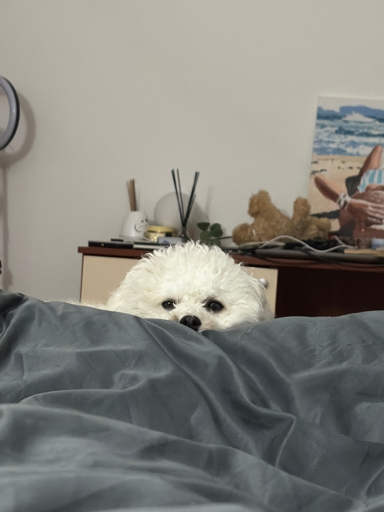 A white, fluffy dog is peeking out from behind a gray blanket or sheet. The dog's eyes are visible, and it appears to be looking directly at the camera. To the left of the dog is a nightstand with a f…read more
