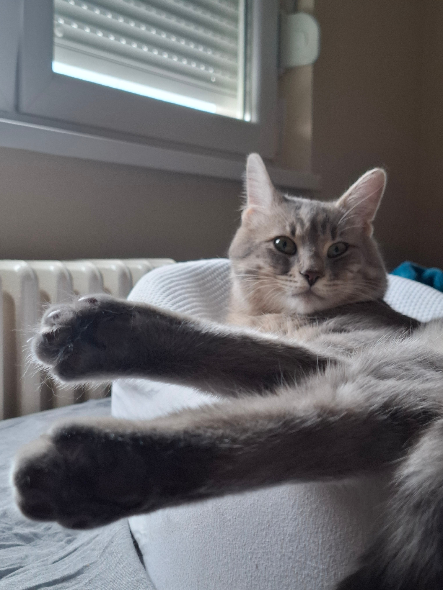 A gray cat is lying on a white pillow. The cat's paws are dangling downwards. The background includes a window with white blinds and a white radiator. The location is likely indoors, possibly in an ap…read more