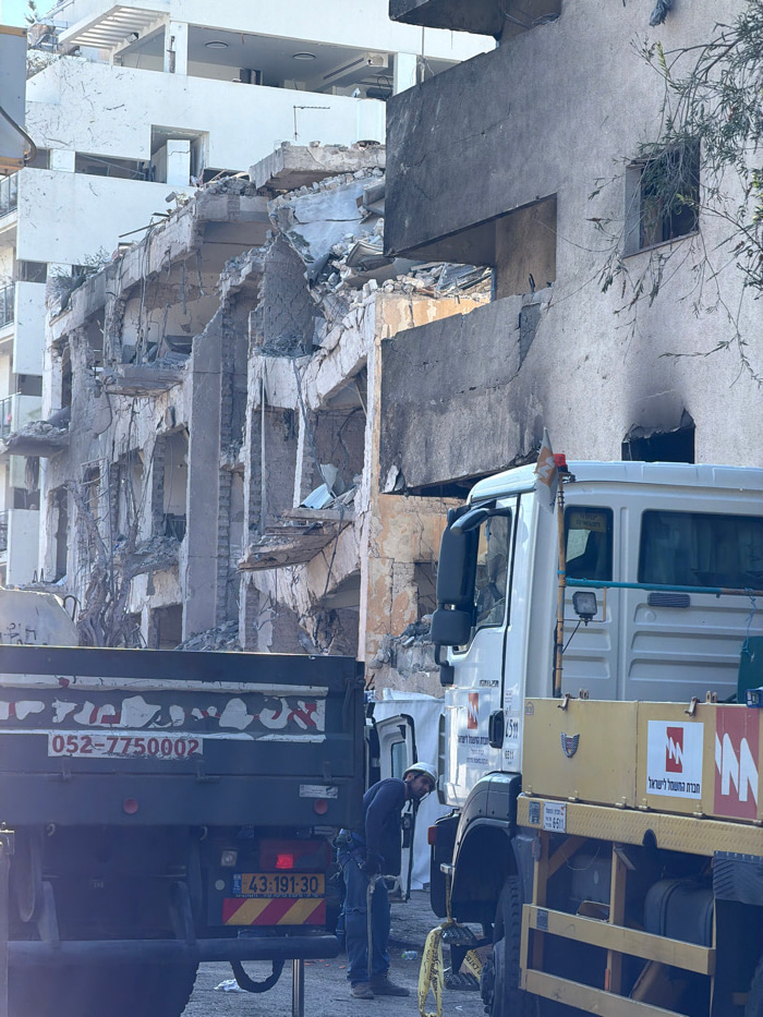 A daytime street-level image depicts a scene of severe structural damage and active work in Tel-Aviv, Israel. In the background, a multi-story building exhibits extensive collapse across its lower and…read more
