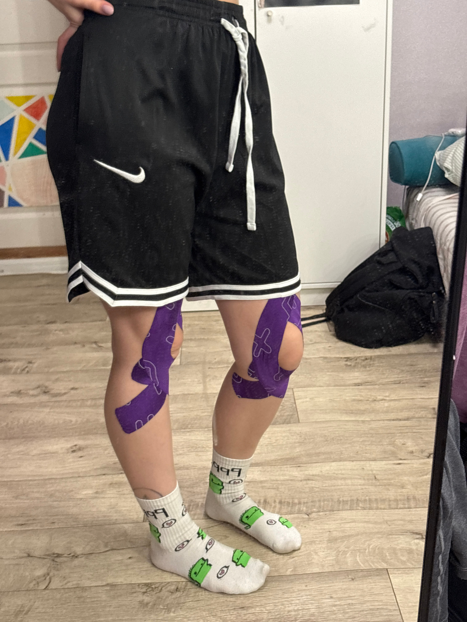 The image shows a person's legs wearing black athletic shorts with a white Nike logo and white trim. Both knees are covered with purple kinesiology tape. The person is wearing white socks with green c…read more