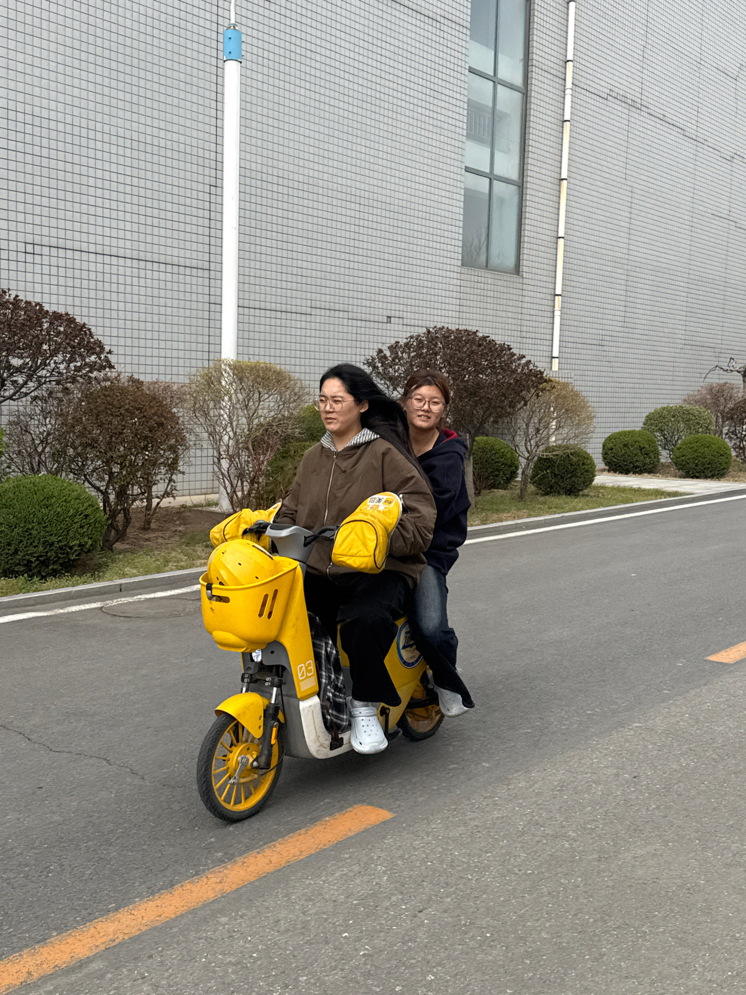 This image captures two individuals on a bright yellow electric scooter, likely a shared service vehicle, on an asphalt road in Zhongtun, China. The scooter is facing left from the viewer's perspectiv…read more