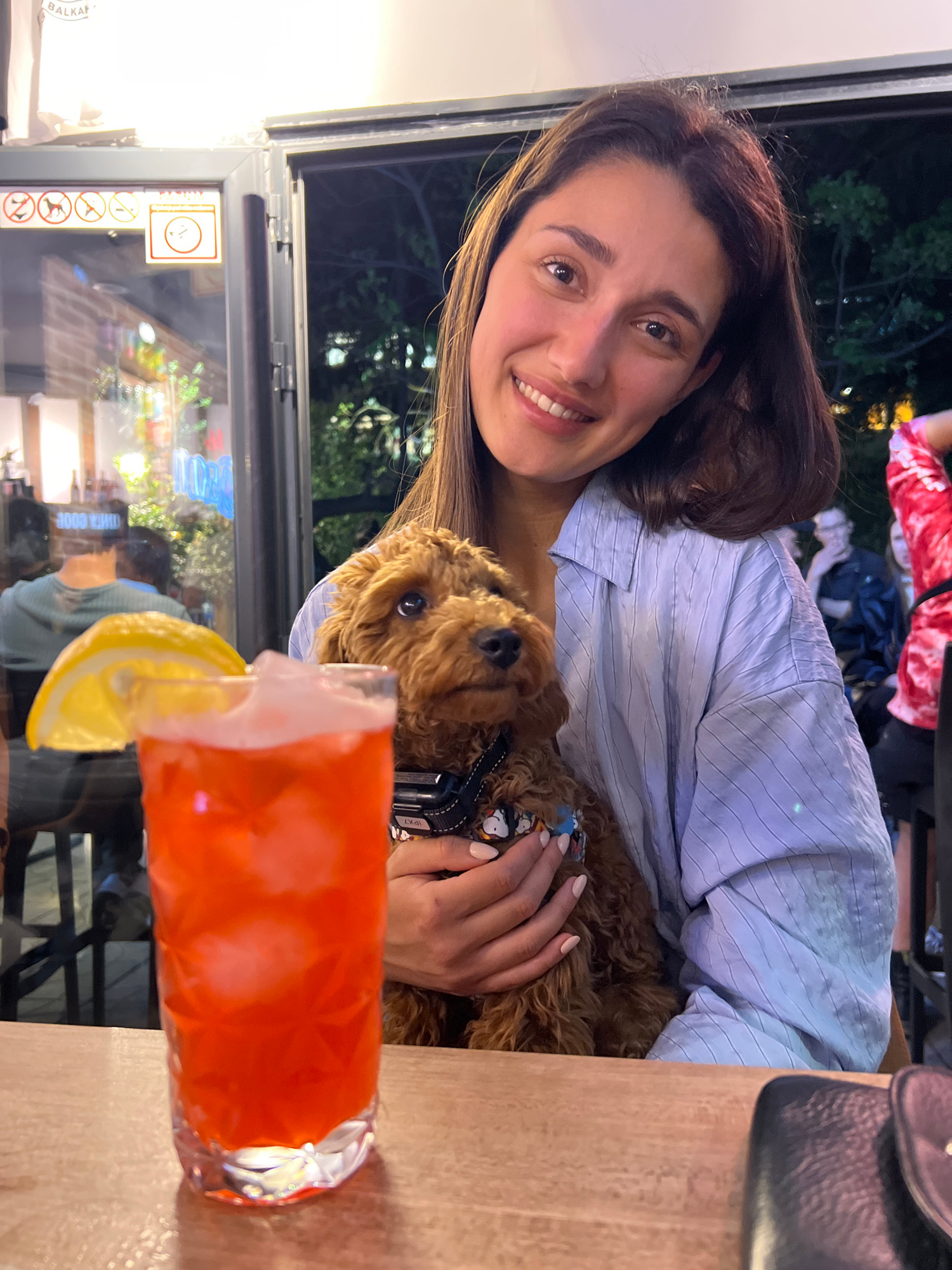 A woman with long brown hair smiles at the camera while holding a brown poodle. She wears a light blue striped shirt. In the foreground, a tall glass of orange liquid with a lemon wedge rests on a woo…read more