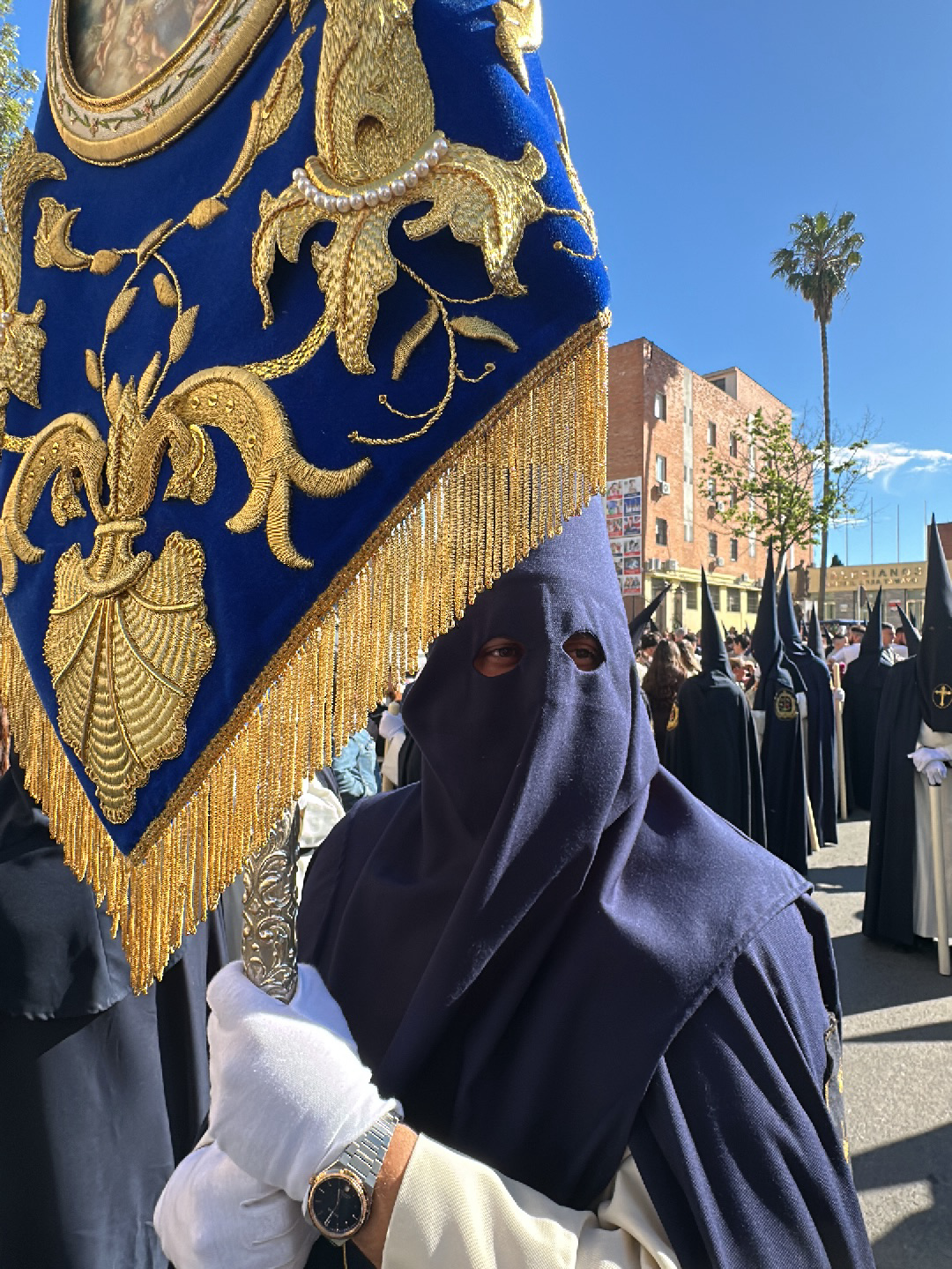 A photograph shows a religious procession in Jerez de la Frontera, Spain. A person wearing a dark blue robe and hood is in the foreground, holding a blue banner with gold embroidery and fringe. The pe…read more