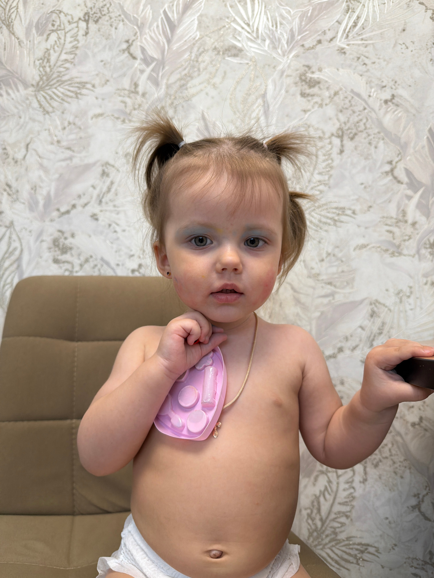 A fair-skinned toddler with blonde pigtails is the central subject of the image. The toddler has light eyes and appears to have some redness or marks on their face. The child is mostly undressed, wearβ¦read more
