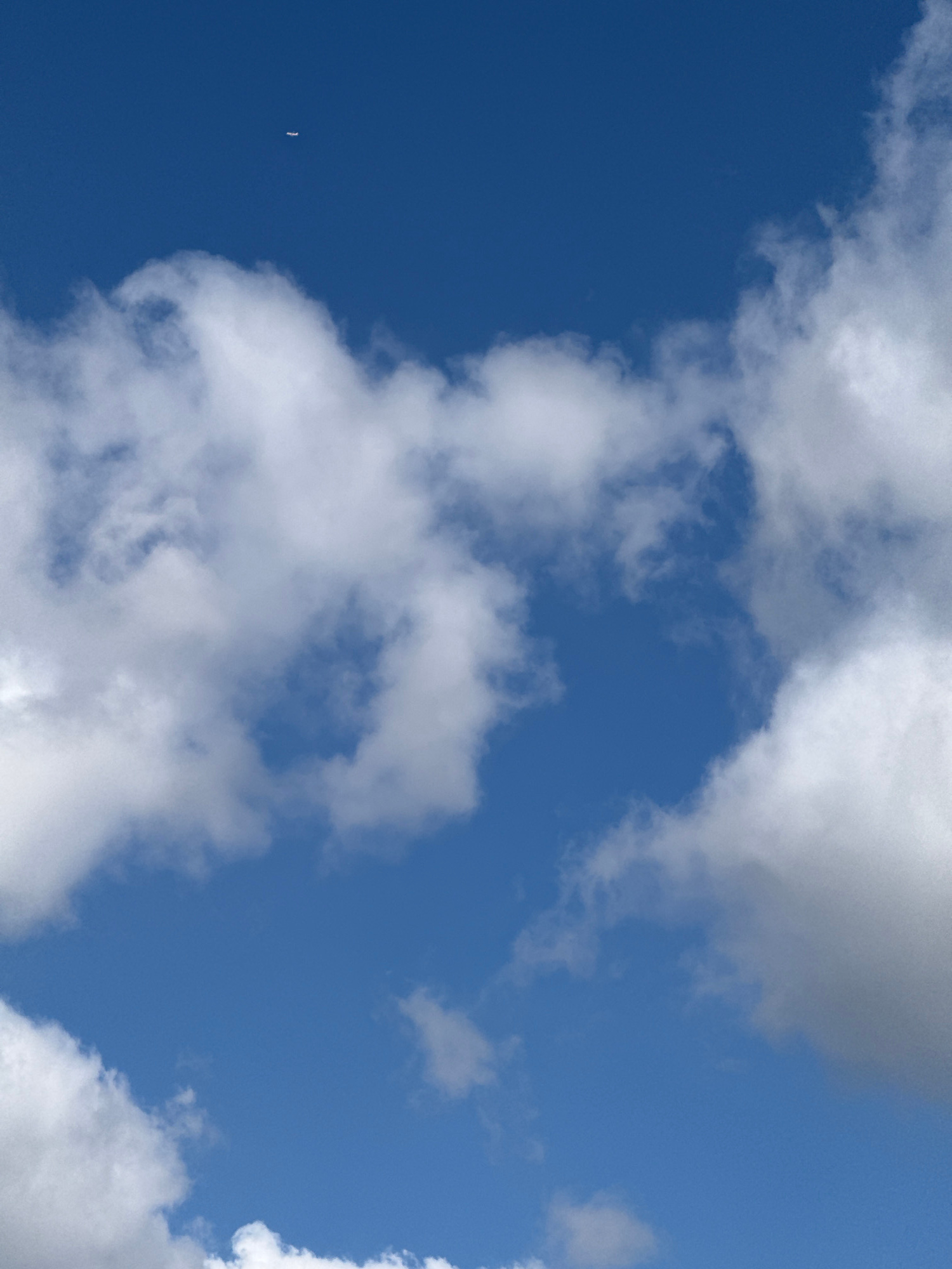 The image shows a blue sky with white clouds. There is a single, thin, white object in the lower left of the frame. There is no evidence in the image to determine its location in Esch-sur-Alzette, Lux…read more