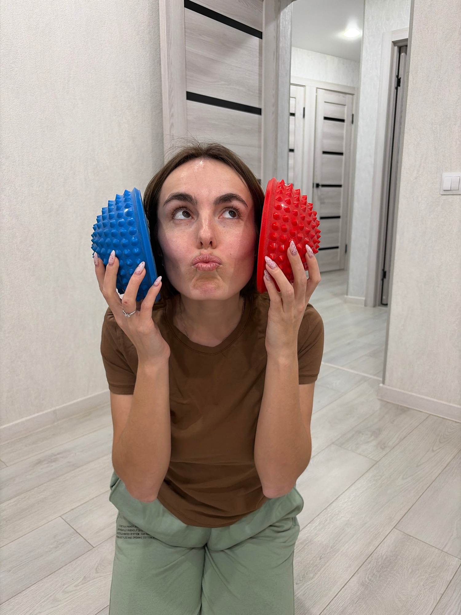 A woman is lying on a light-colored, wood-patterned floor, holding a red, spiky semi-sphere above her head and a blue, spiky semi-sphere under her chin. She is wearing a brown t-shirt and light green…read more