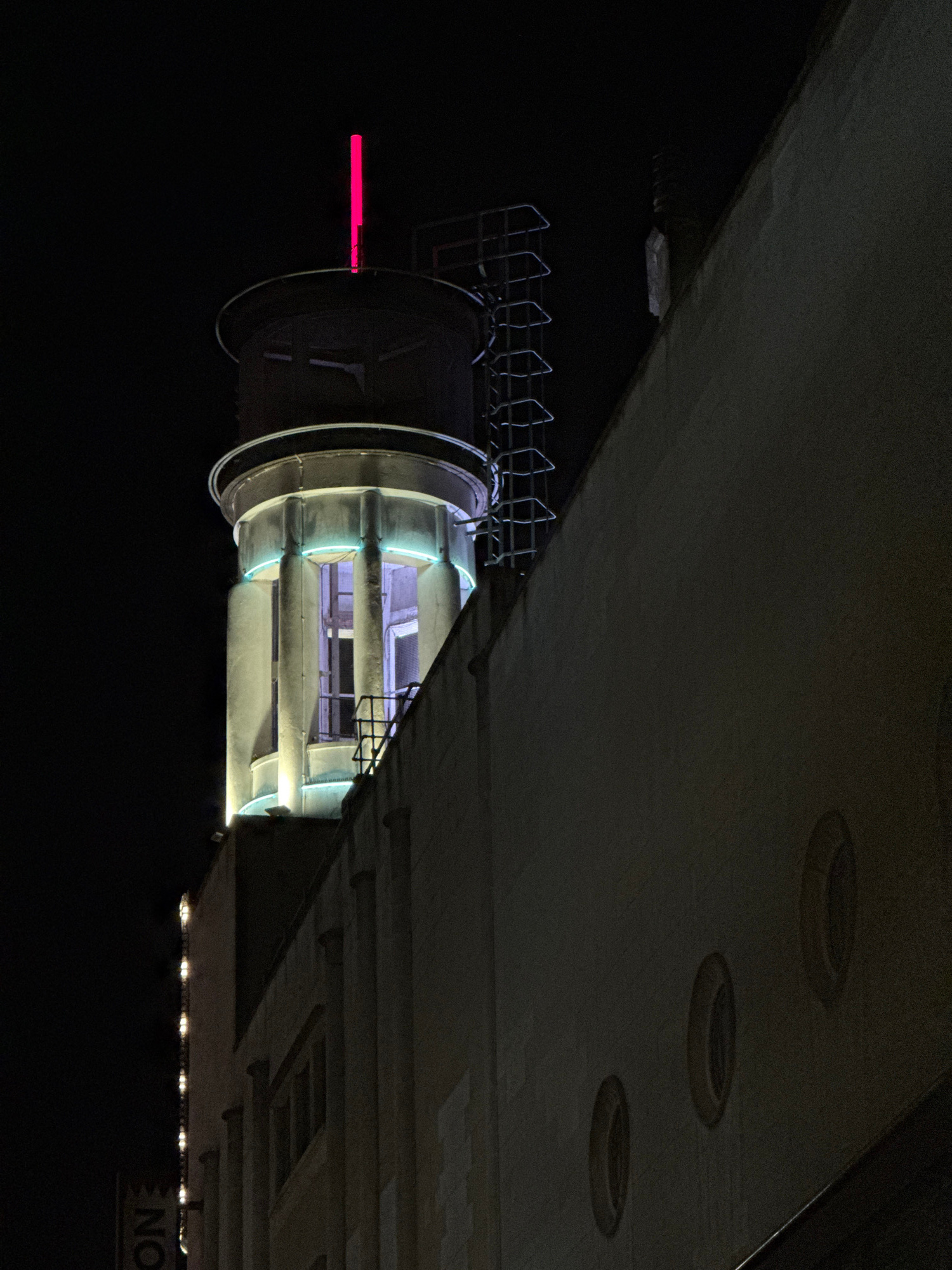 The image shows a low-angle, nighttime view of what appears to be a portion of a modern building, likely a structure within the city of London. The dominant feature is a cylindrical structure with a m…read more