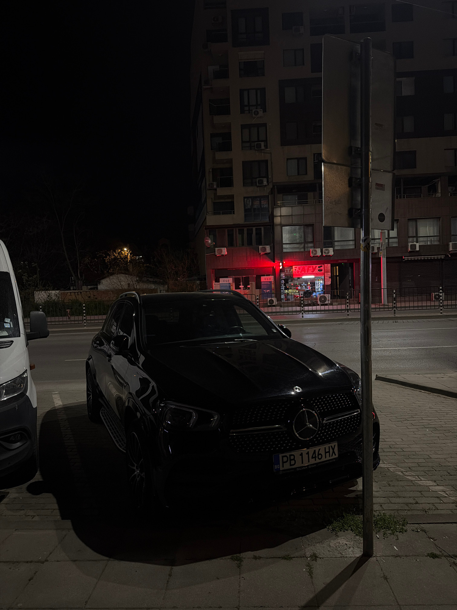 This nighttime image depicts an urban street scene in Plovdiv, Bulgaria. The primary subject is a black Mercedes-Benz car, parked on the right side of the frame, facing away from the viewer. Its rear…read more