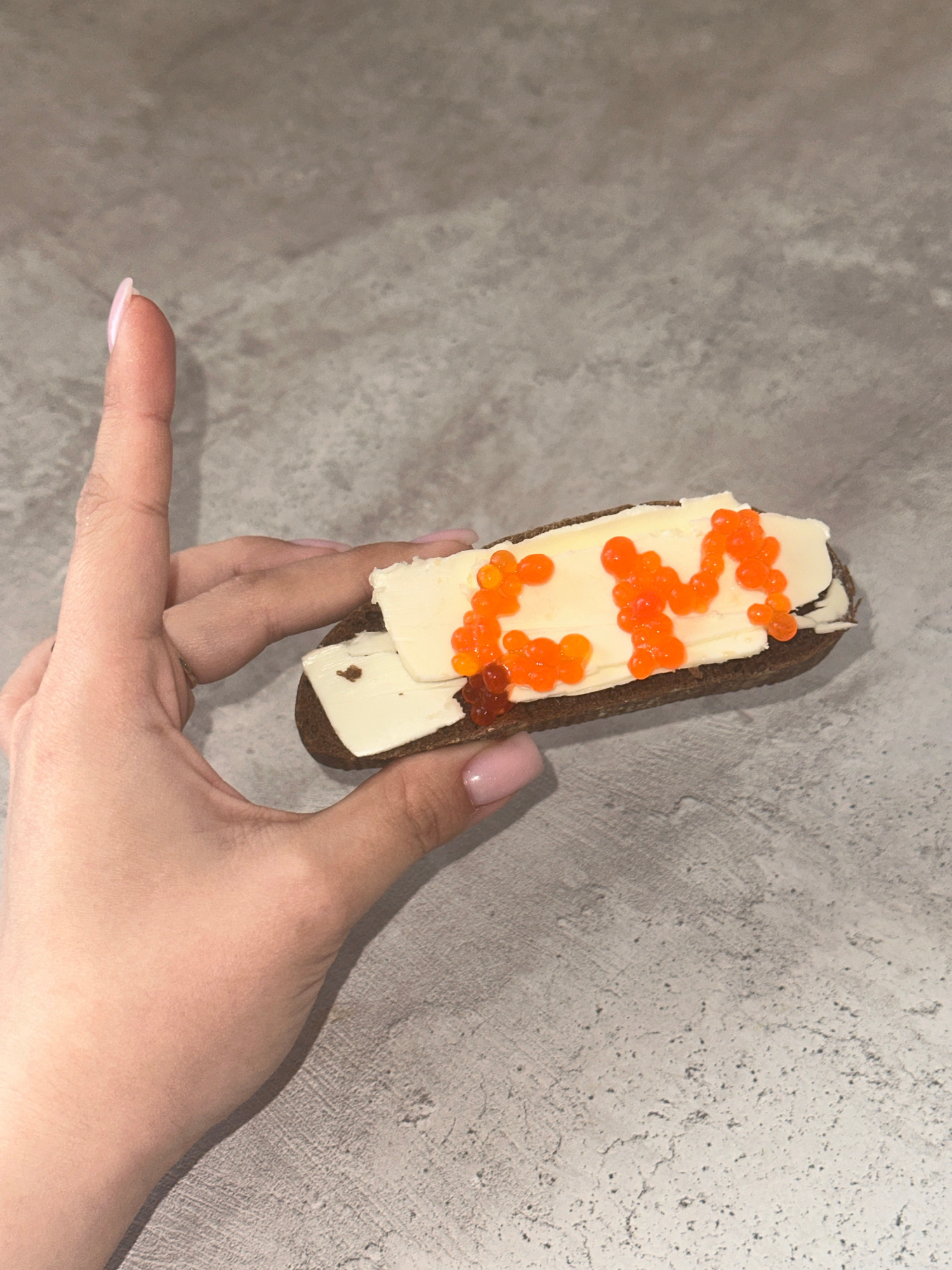 A hand holds a piece of dark bread topped with butter and orange caviar against a gray textured background. The person has manicured nails with pink polish. The location is not discernible from the im…read more