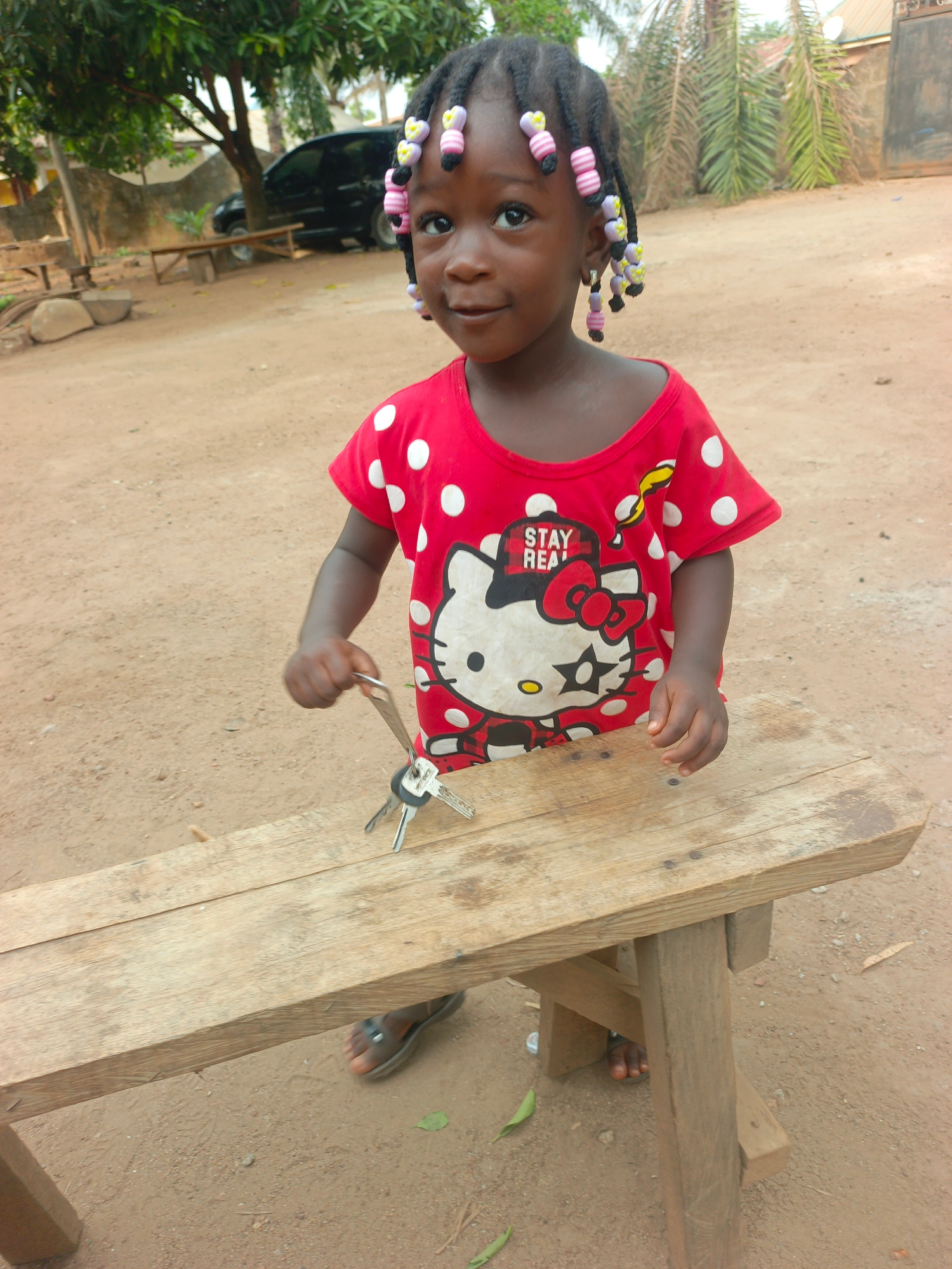 A young child stands behind a wooden bench on a sandy ground in Akwanga, Nigeria. The child, with dark skin and braided hair adorned with colorful beads, wears a red and white polka-dot shirt featurin…read more