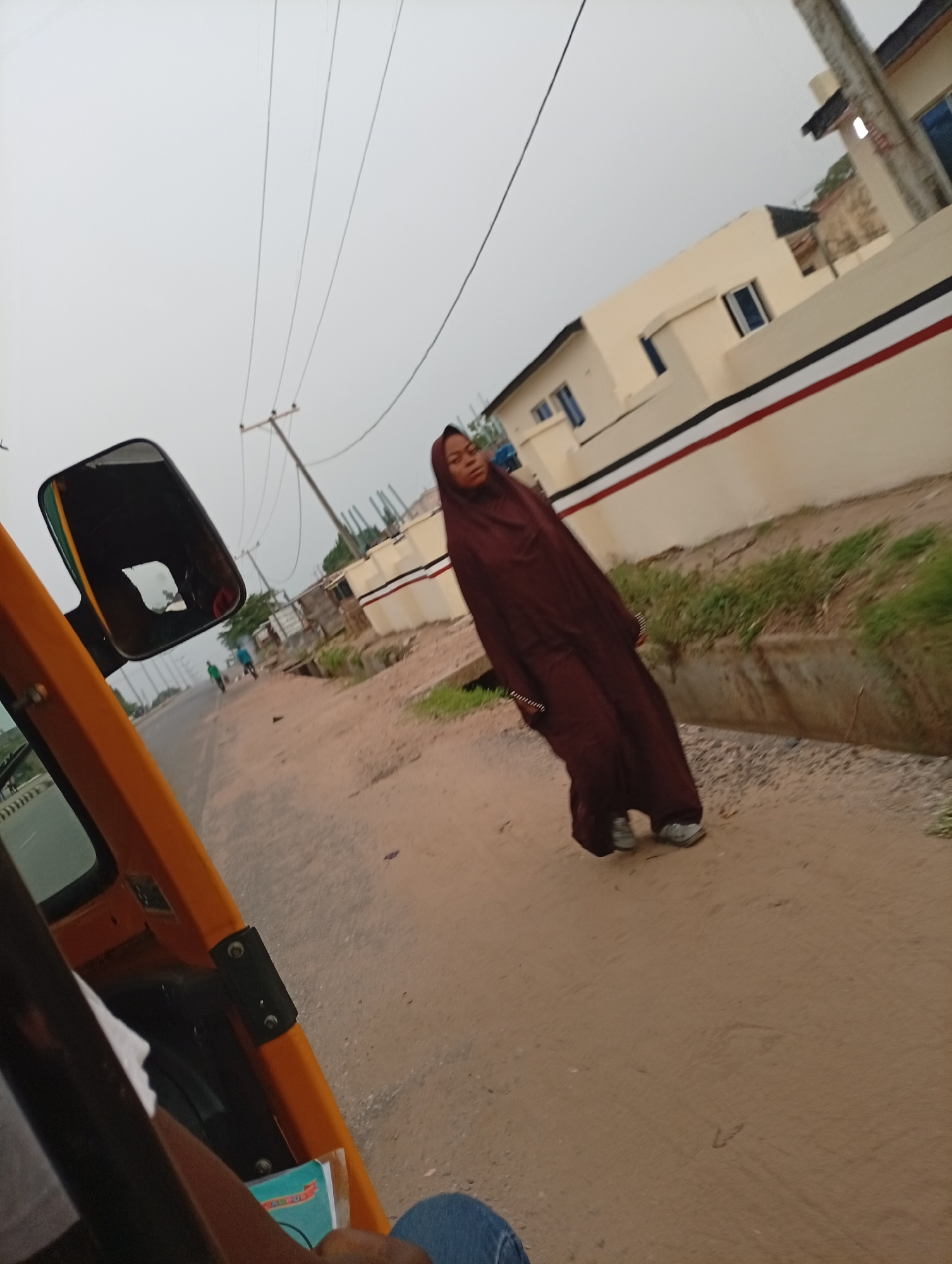 A woman wearing a dark brown abaya walks alongside a road in Adankolo, Nigeria. The road appears unpaved. A ditch runs along the side of the road. Behind the woman is a white building with a red and b…read more