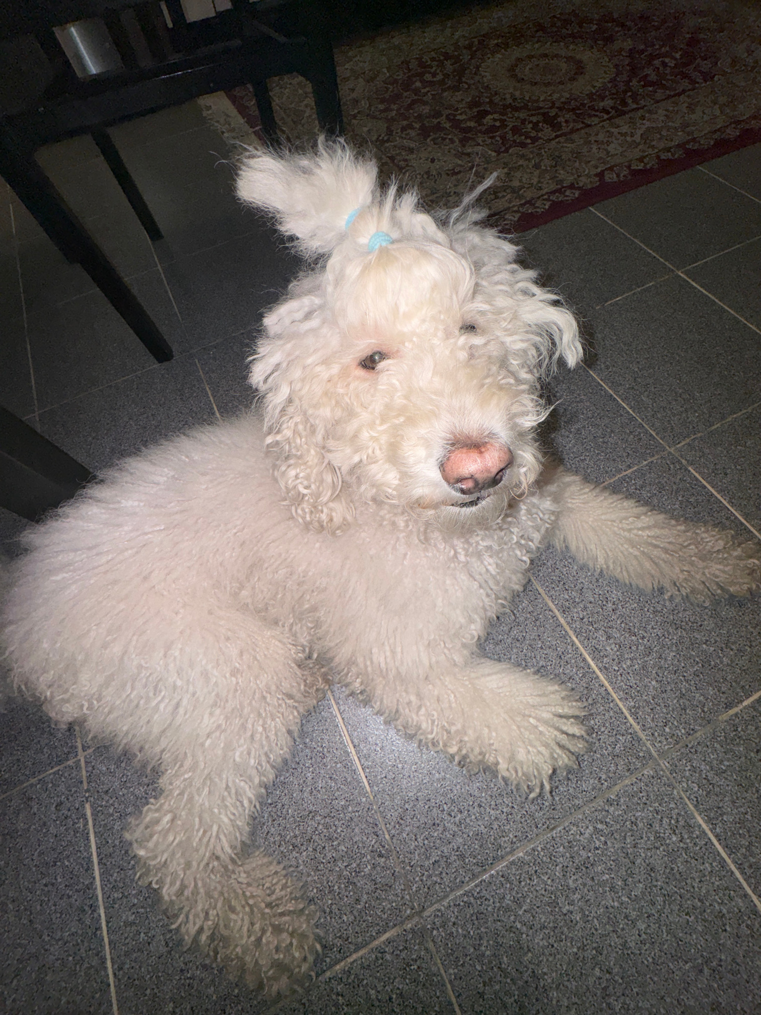 A white dog with curly fur lies on a gray tile floor. The dog has a pink nose and one visible eye. A light blue hair tie is visible in its fur. Parts of a patterned rug and a black chair are visible i…read more