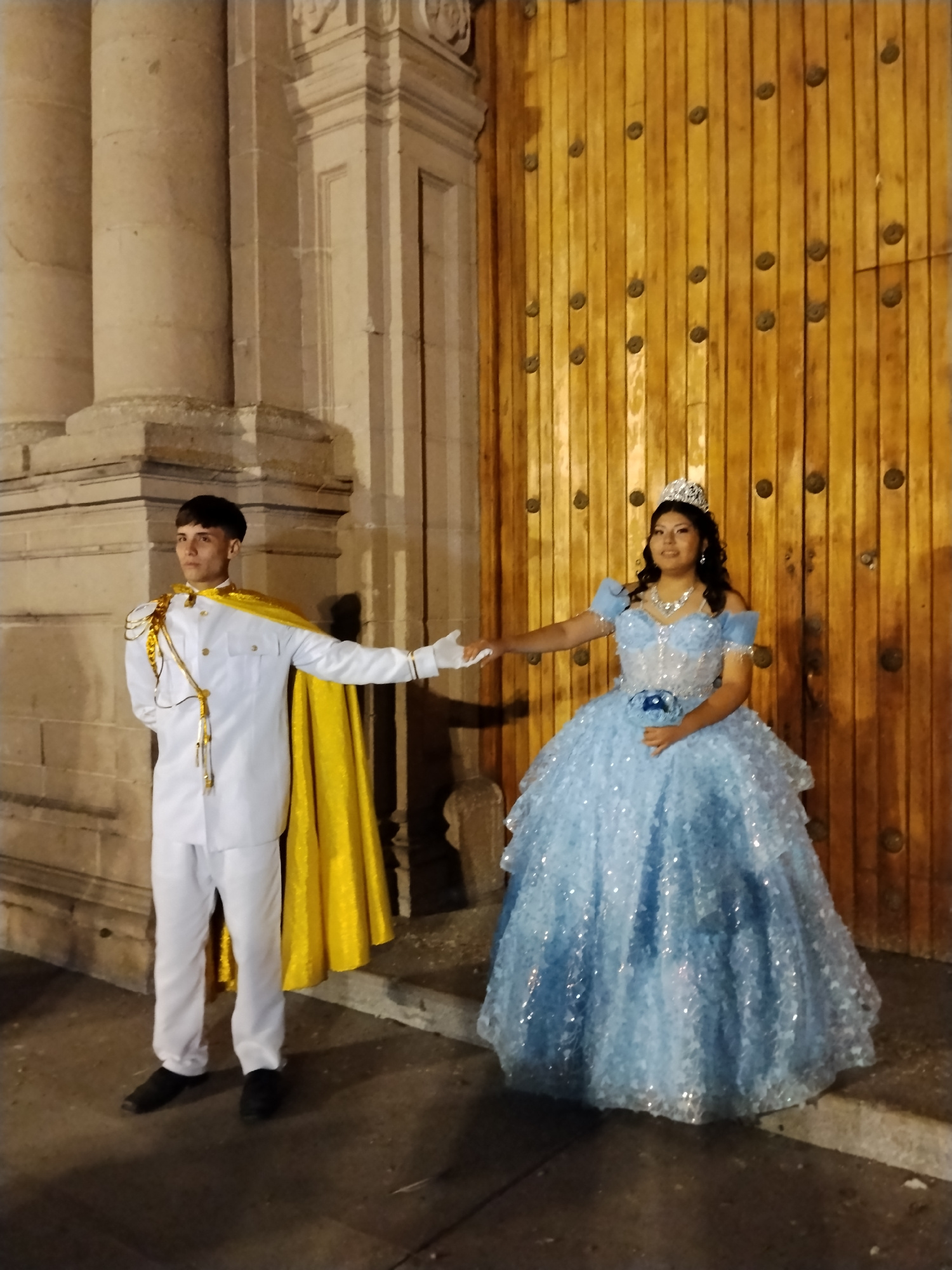 This image captures two young individuals, a man and a woman, posing formally in front of a grand architectural background at what appears to be an evening event in Tacna, Peru. The woman, likely the…read more