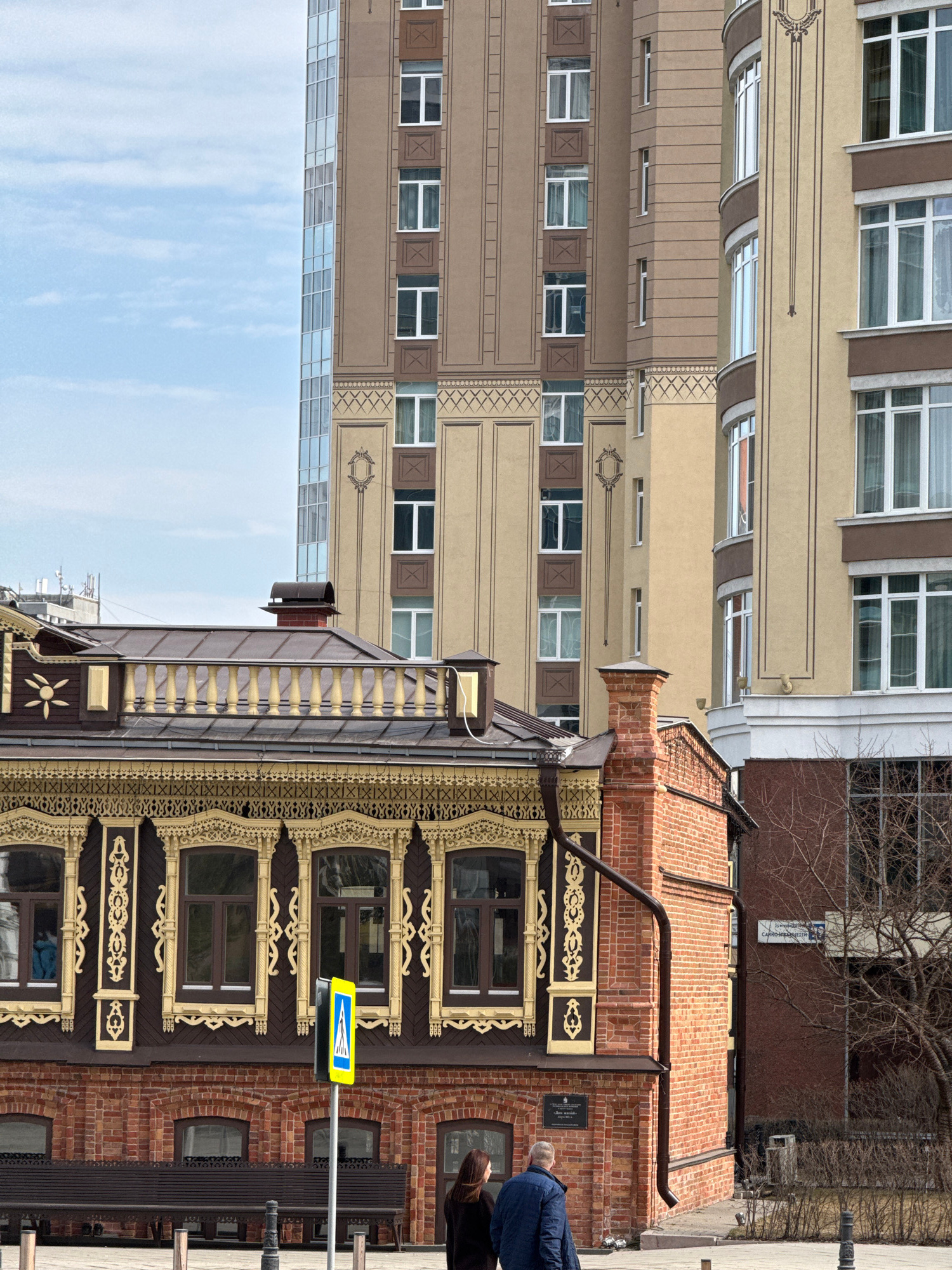 The image shows an architectural juxtaposition in Yekaterinburg, Russia, featuring a traditionally ornamented wooden house alongside a modern building. The wooden house exhibits ornate carvings and br…read more
