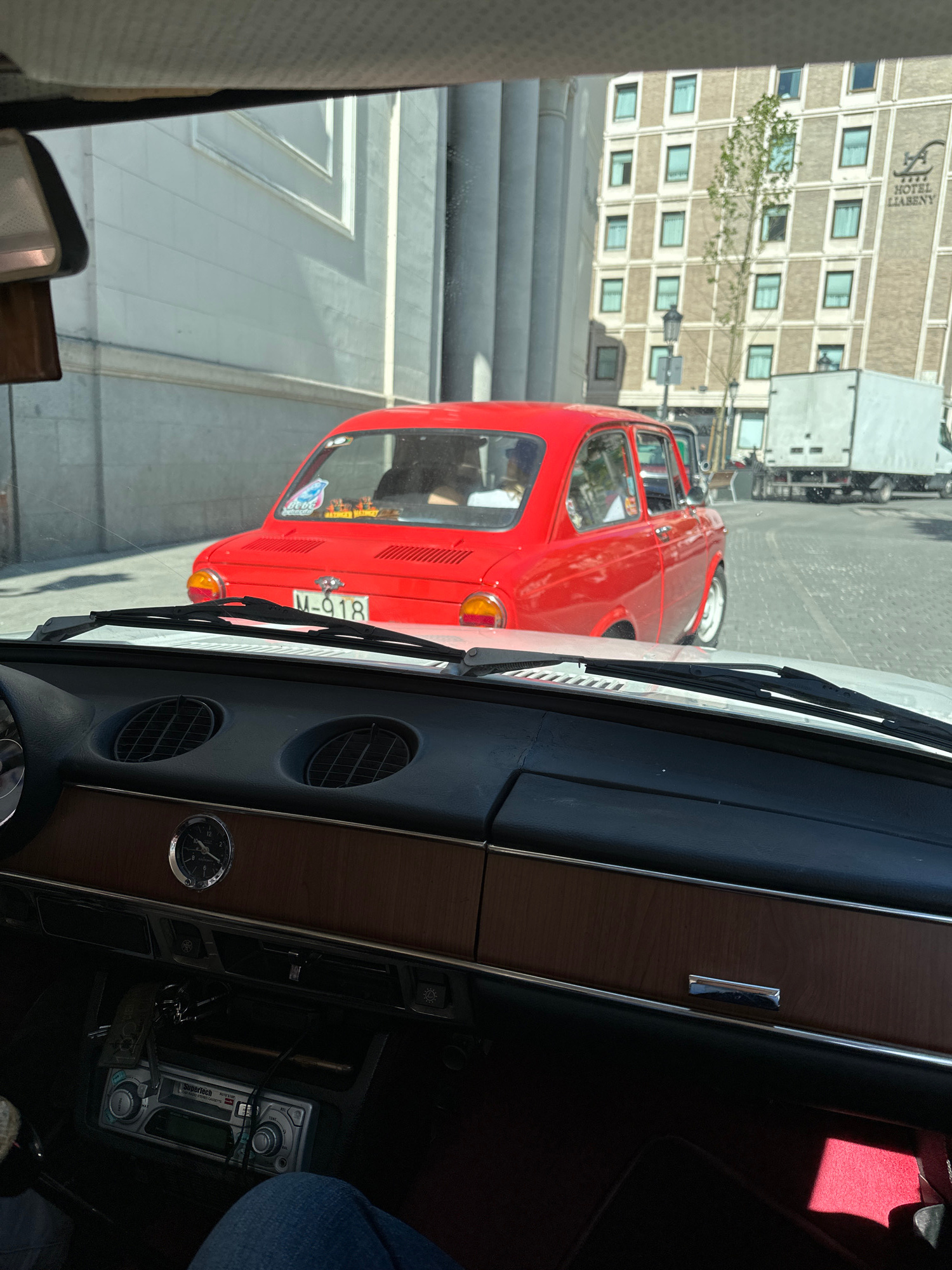 The image, shot from inside a vehicle, features a red car visible through the windshield. The dashboard of the vehicle has a retro design with circular vents and a clock. A silver cassette player is i…read more