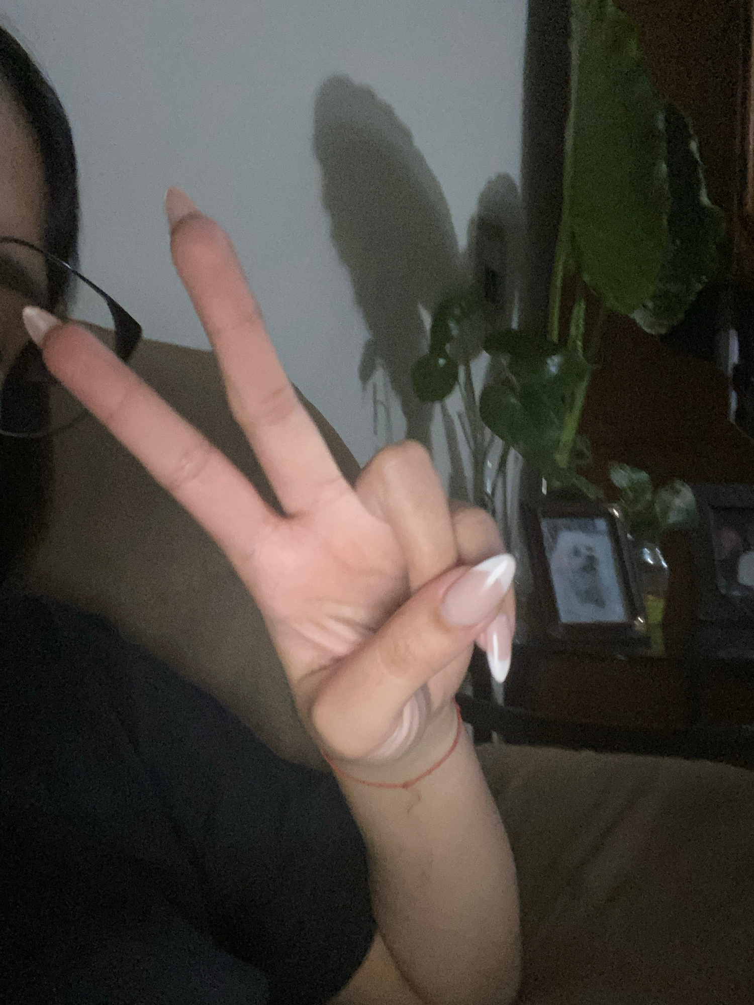 The image shows a hand making a peace sign. The hand has long, manicured nails with white tips. A red string bracelet is visible on the wrist. Part of a person's face, including the hairline and glass…read more