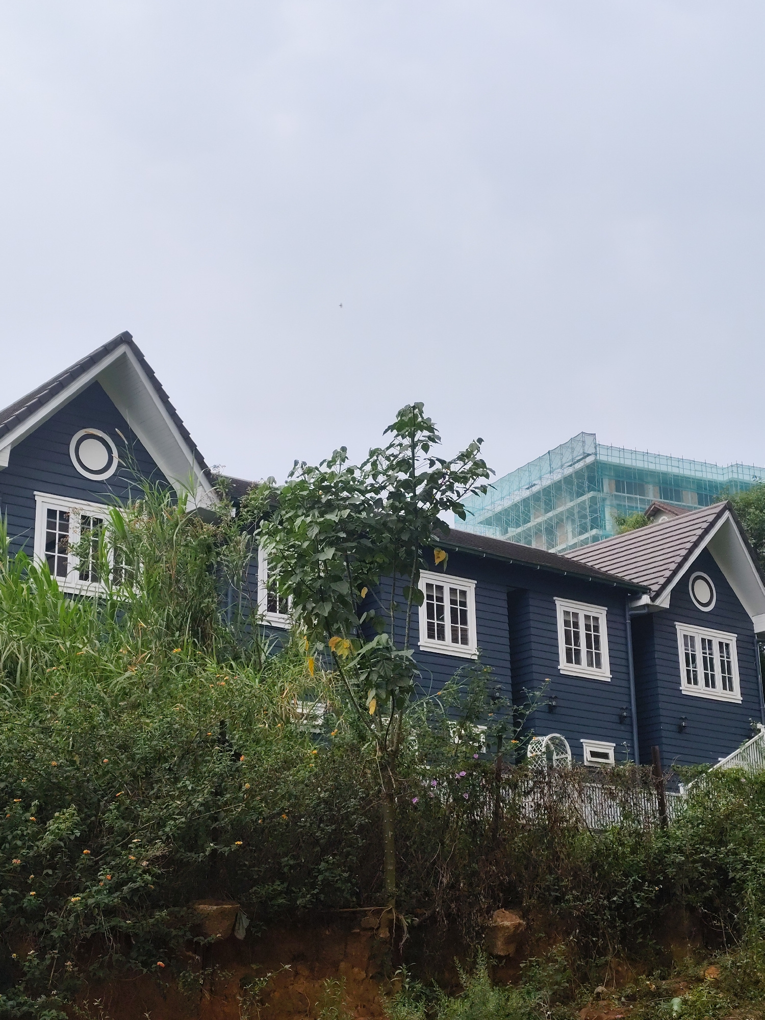The image captures a two-story navy blue house with white trim in Da Lat, Vietnam. The house features multiple rectangular windows and circular decorative elements near the gabled roof. Lush greenery…read more