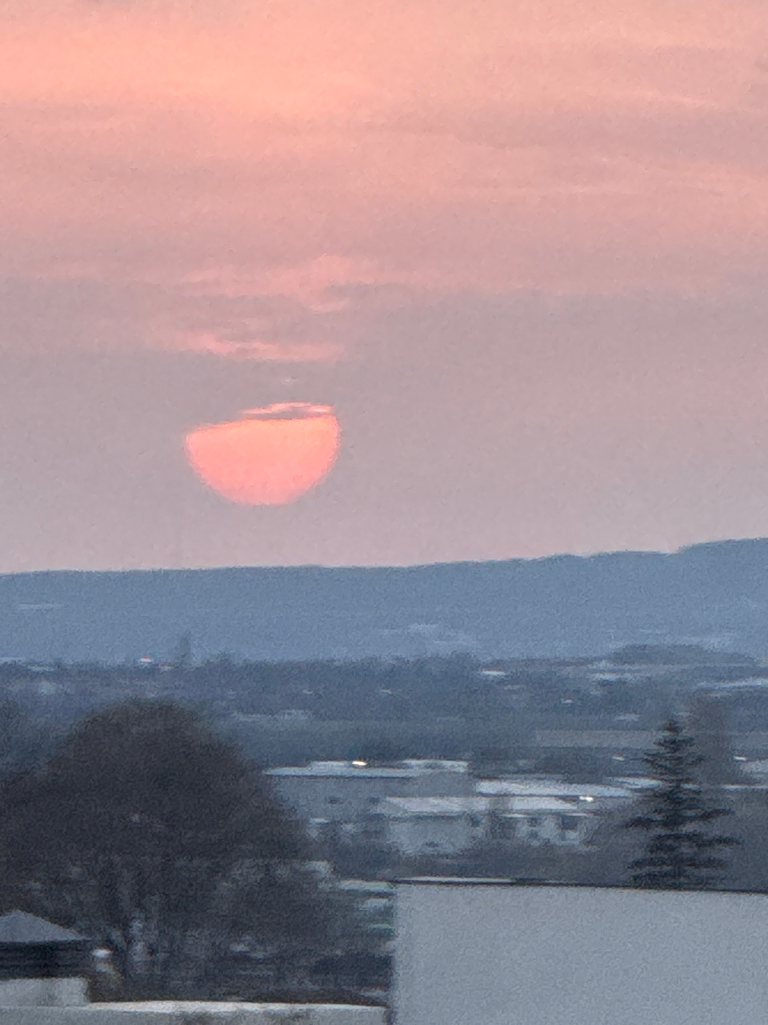 A horizontal view shows a sunrise or sunset next to a hazy cityscape. A large, half-disk of orange sunlight sits left of center, over a layer of blue, hazy land. The left side of the image shows a pal…read more