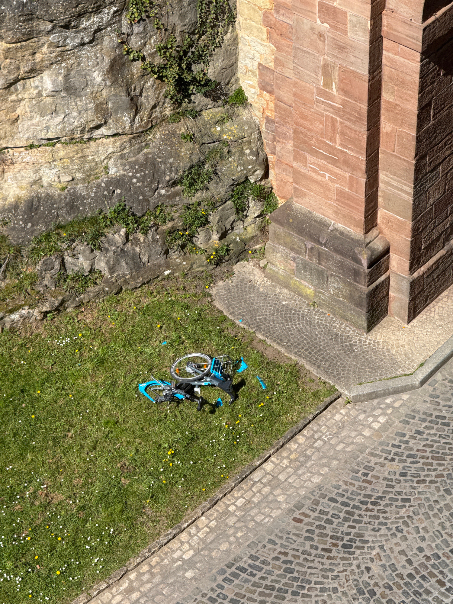 Captured from a high-angle perspective, the image depicts a section of the city of Luxembourg, Luxembourg, where architecture, nature, and an abandoned bicycle converge. The composition features the c…read more
