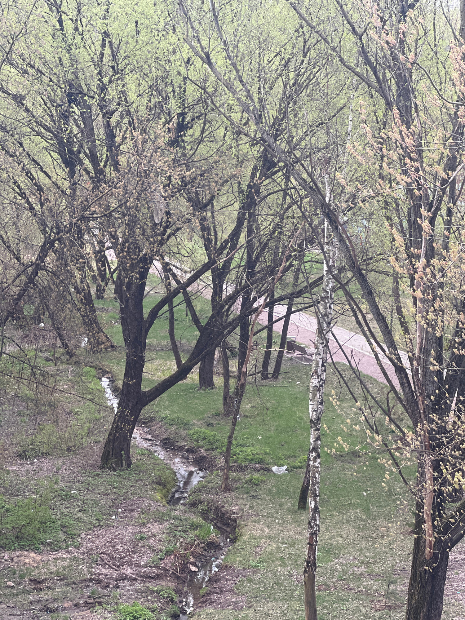 The image shows a landscape in Khimki, Russia. A line of trees with budding leaves is in the foreground. Behind the trees is a grassy area with a narrow stream running through it. A paved path is visi…read more