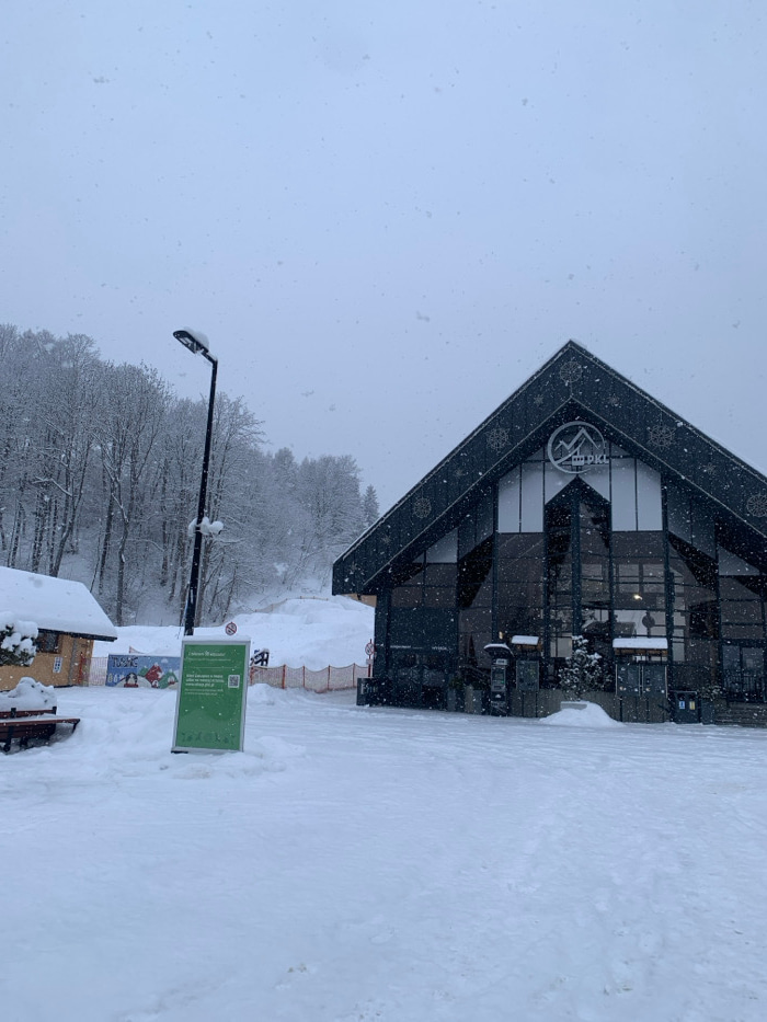 The image depicts the Gubałówka funicular railway lower station in Zakopane, Poland, during heavy snowfall. The scene is dominated by a modern, dark-paneled building with a steep gabled roof and exten…read more