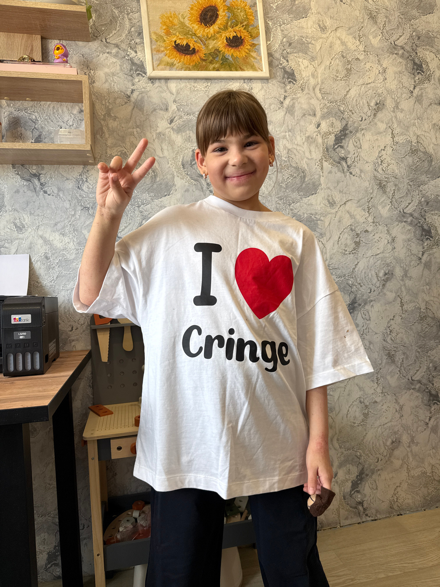A young girl wearing a white t-shirt with the phrase "I (heart) Cringe" is seen indoors. She is holding up a peace sign with her left hand and appears to be holding something in her right hand. A pain…read more