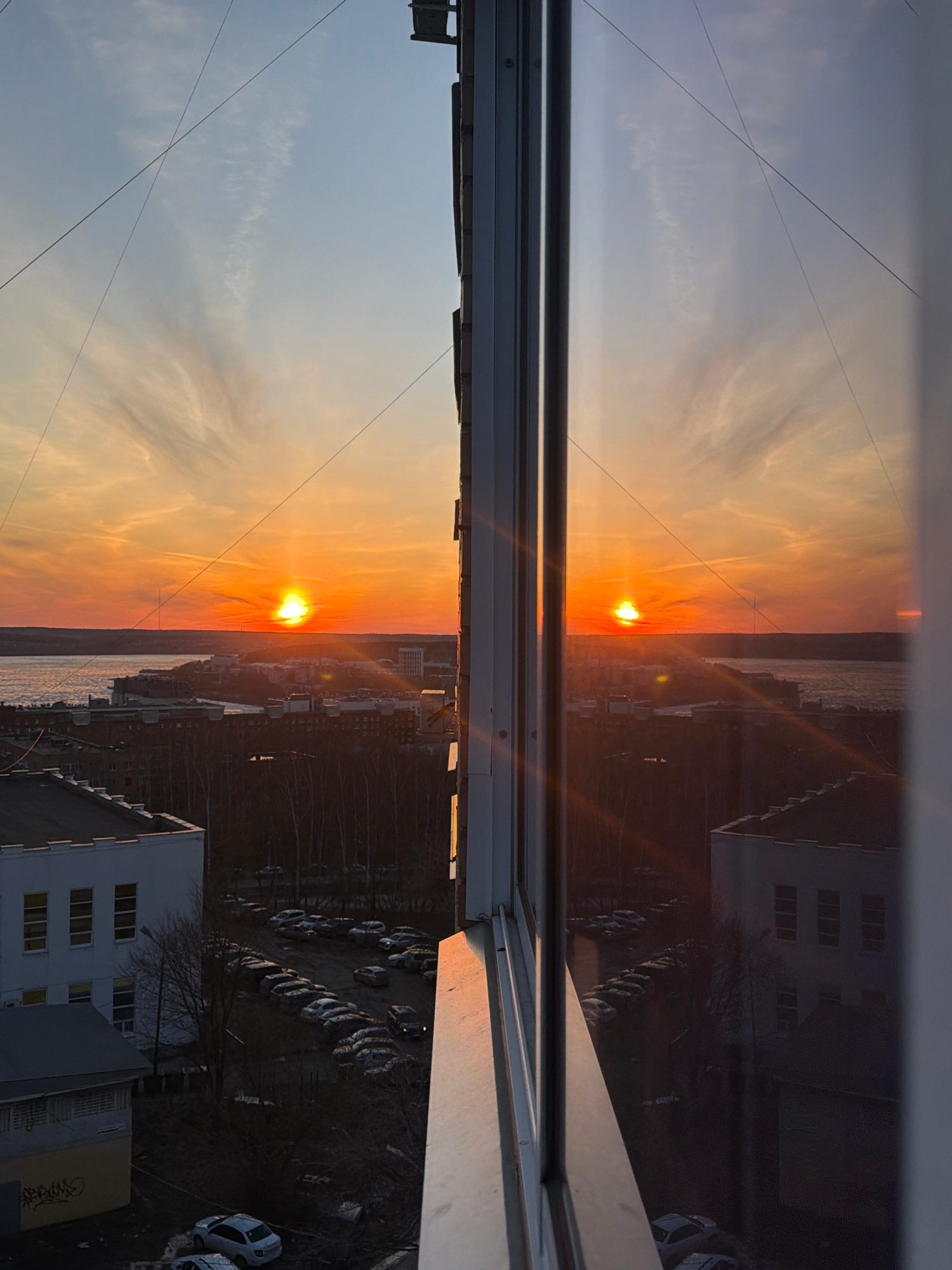 The image shows a sunset over Izhevsk, Russia, reflected in a window. The sky is a gradient of light blue to orange, with the sun appearing as a bright orange orb. Below the horizon line, the reflecti…read more