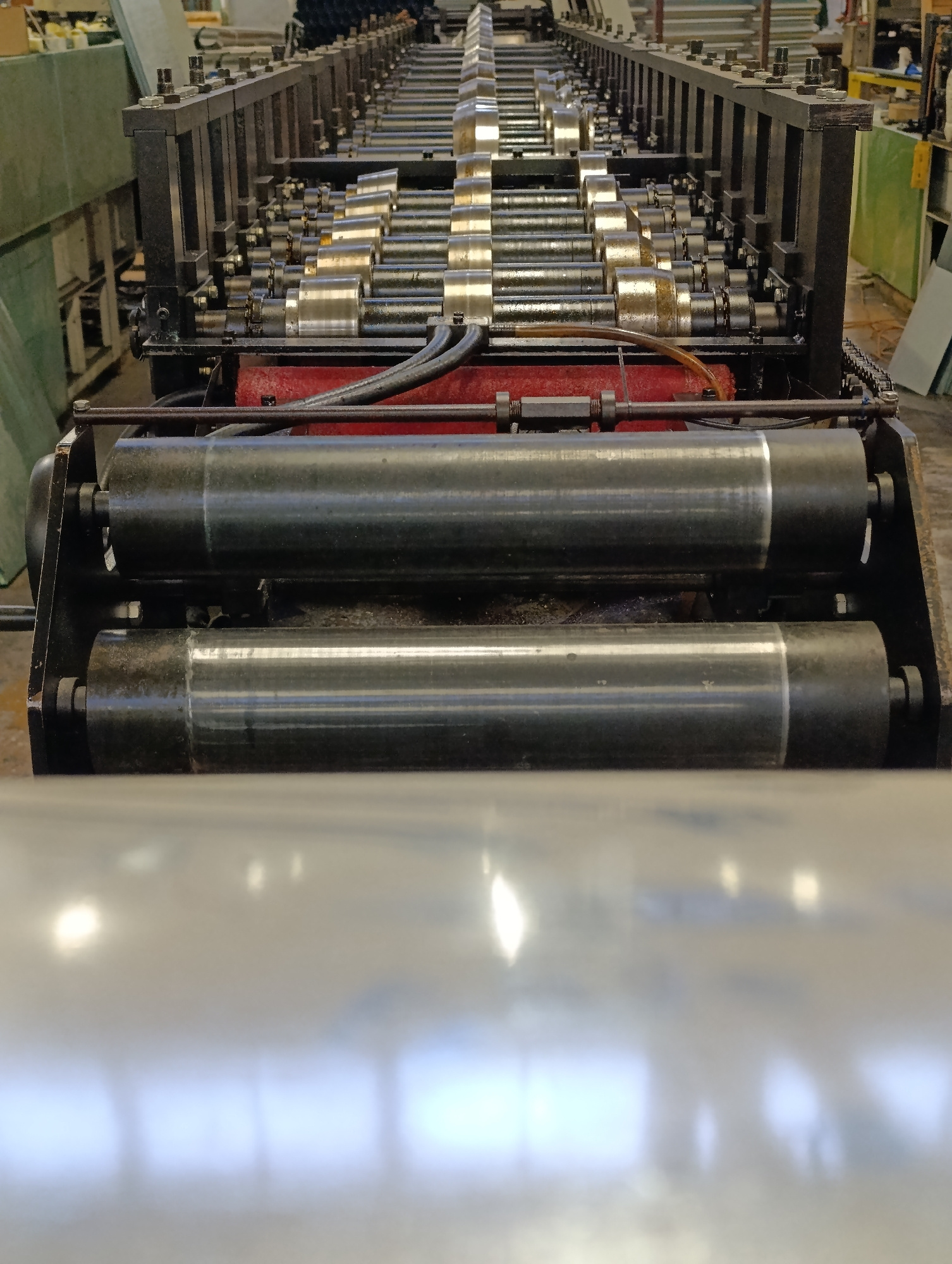 The image shows a metal forming machine in a factory or industrial setting. The machine has numerous rollers and is designed to shape metal sheets. The foreground features a large, shiny metal sheet p…read more