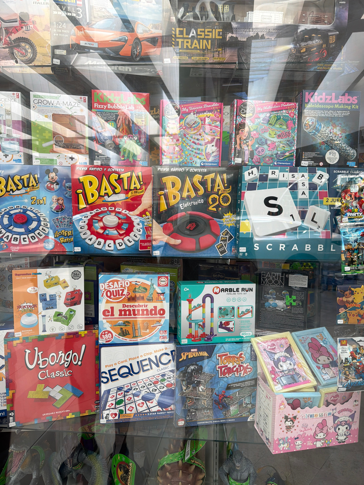 This is a medium-shot, overhead, eye-level photograph of a variety of games and hobby items displayed in a store. The items, mostly board games and kits, are arranged in a grid pattern under a glass s…read more
