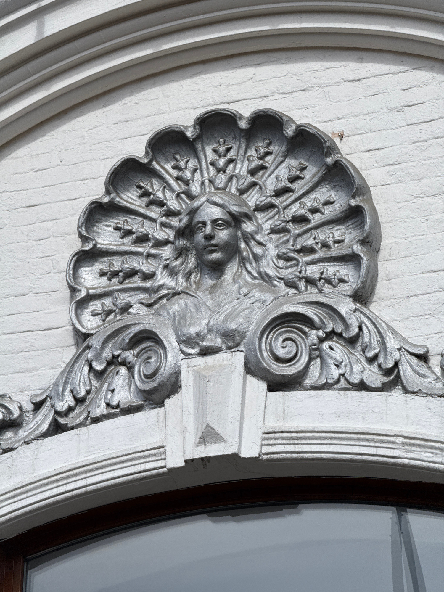 Close-up shot of architectural detail featuring a face in a floral motif, possibly an allegorical representation, mounted on a white brick wall. To the right, decorative column design elements are vis…read more