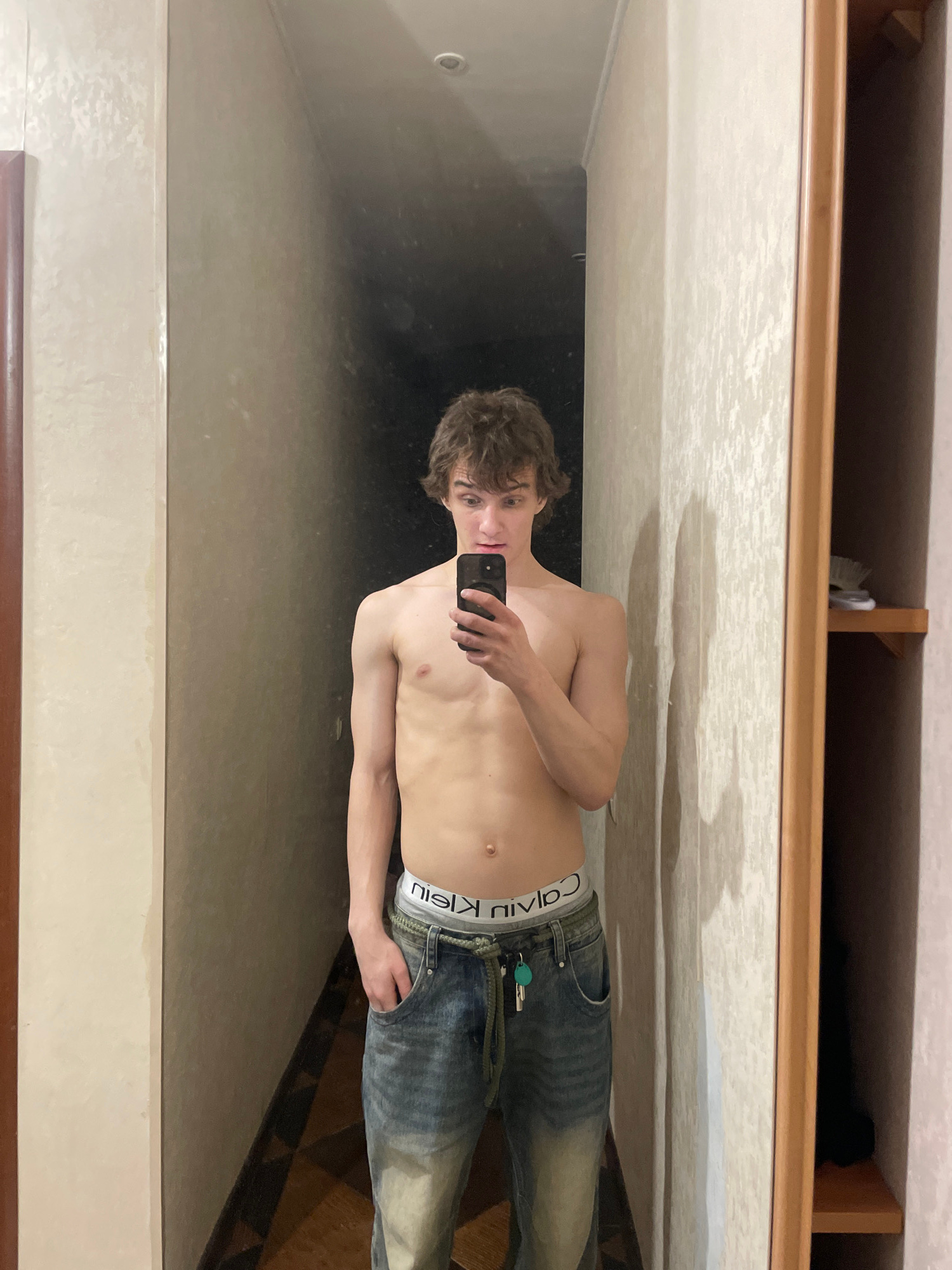 A young, shirtless male with curly brown hair is taking a mirror selfie. He is wearing blue jeans with a visible Calvin Klein waistband. The reflection reveals a bathroom setting with a vanity cabinet…read more