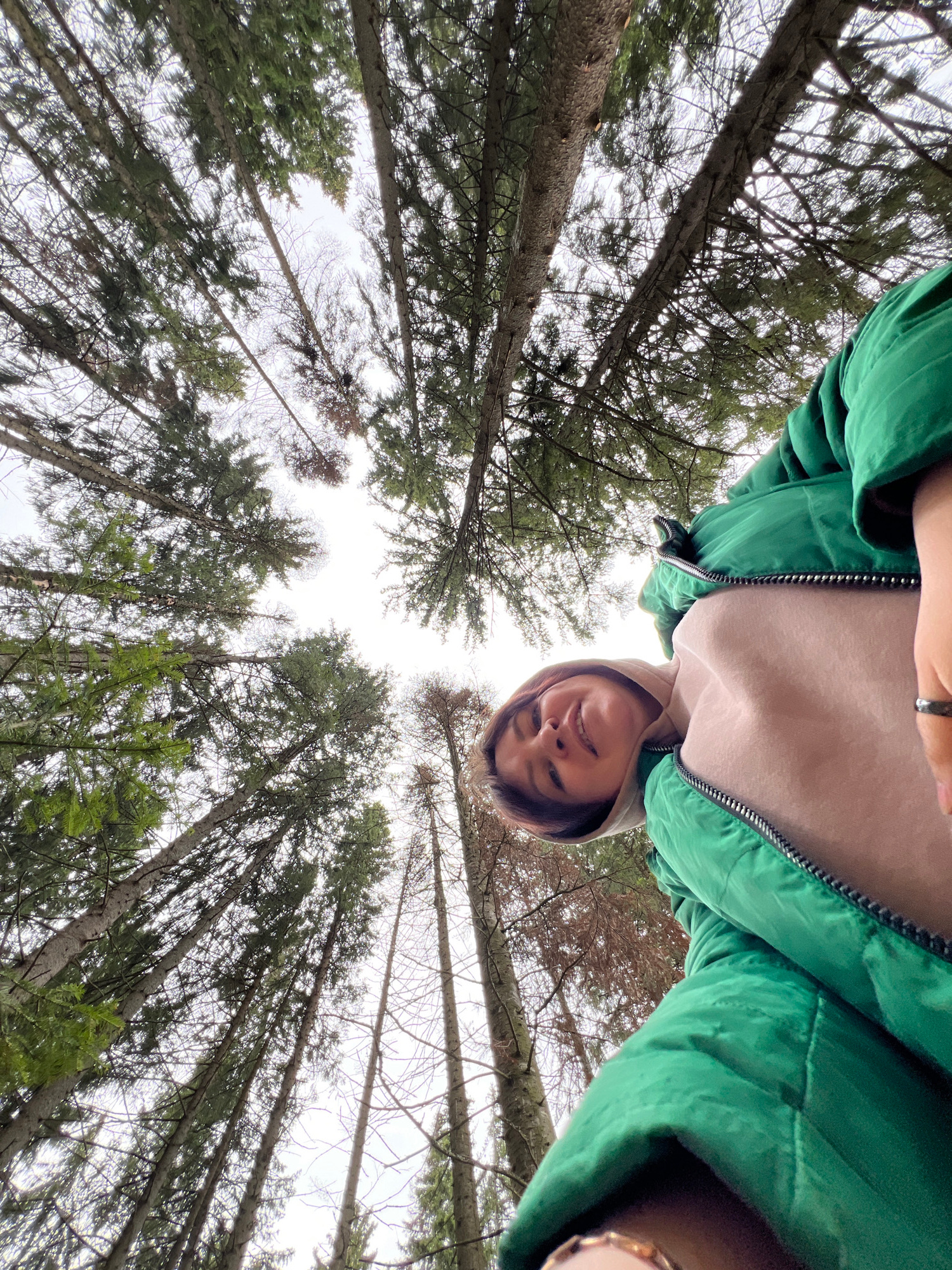 A person stands in a forest in Protasy, Russia, taking a selfie while looking upwards at the tall pine trees. The person is wearing a green jacket and a beige hooded sweatshirt. The trees are tall and…read more