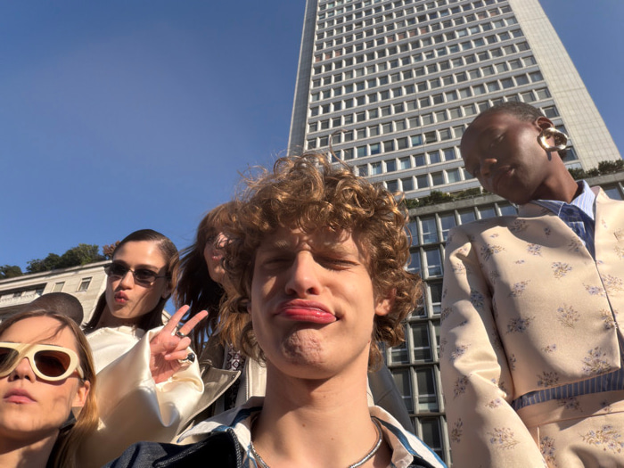 The image displays an outdoor, low-angle group selfie featuring four prominently visible individuals and one partially obscured person, taken under a clear blue sky. The background features a tall, mo…read more
