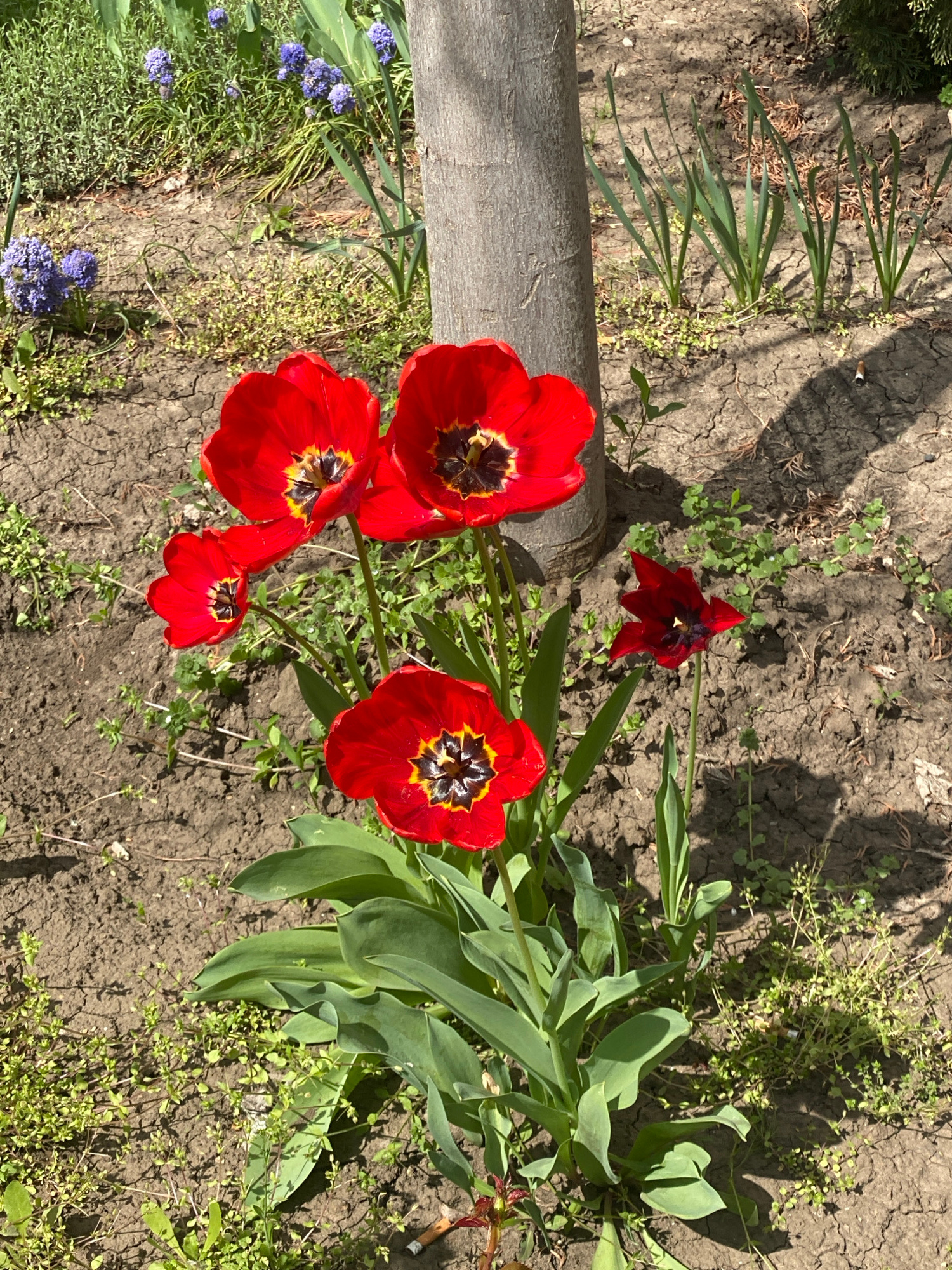 This vertical, overhead photograph captures a vibrant garden scene in Krasnodar, Russia, during what appears to be a sunny spring or early summer day. The main subjects are several strikingly red tuli…read more