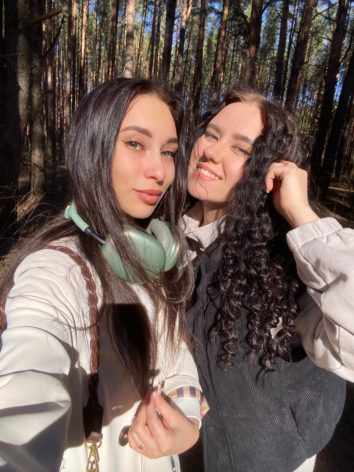 Two women are posing for a photo in a forest setting. The woman in the foreground is wearing light-green headphones and a white coat. The woman behind her has curly dark hair and wears a black top wit…read more