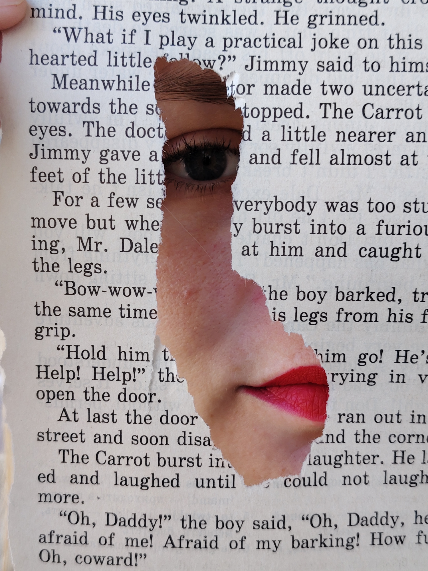 The image presents a close-up view of a page from a book, printed with black text on light paper. A large, irregular tear cuts through the page, revealing fragments of a human face. Through the upper…read more