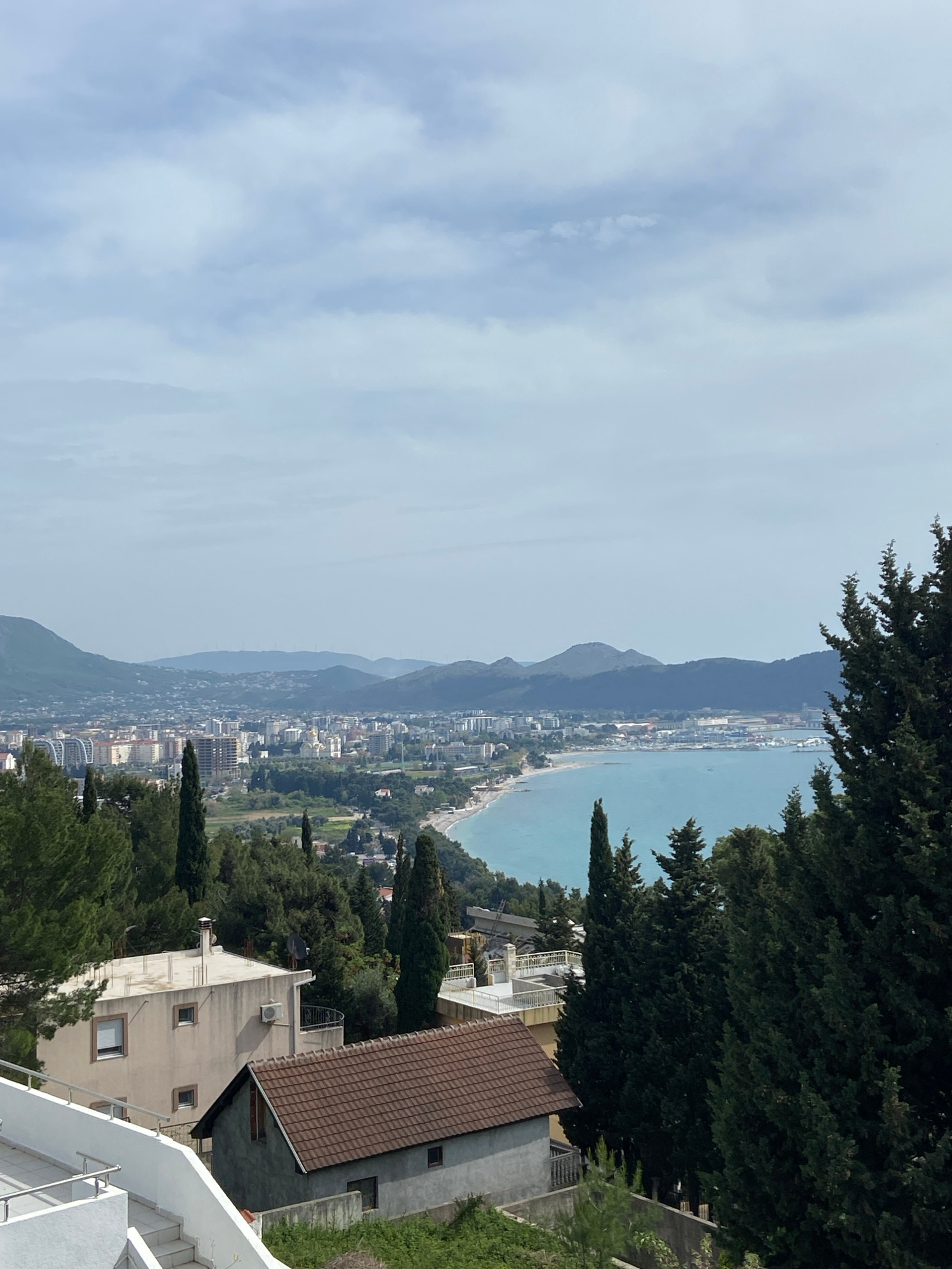 The image presents an expansive elevated view of a coastal landscape, likely captured on an overcast or hazy day. The primary focus is a bustling coastal town situated along a bay, flanked by mountains. In the foreground, on the right side, residential buildings with a mix of light-colored walls and tiled roofs are visible, nestled among numerous tall, dark green trees, possibly cypress. A white staircase with a metallic handrail ascends on the far right, suggesting a terraced or sloped terrain. The midground features a long stretch of urban development forming the coastal town of Šušanj, Montenegro. Numerous buildings of various sizes and architectural styles densely populate the area between the sea and the foothills of the mountains. Green vegetation is interspersed throughout the town, adding to the landscape. To the left of the town, a tranquil, light blue body of water, presumably the Adriatic Sea or a bay, extends towards the horizon. A distinct coastline and narrow beach area are discernible where the town meets the water. Beyond the water, a prominent range of dark mountains rises steeply, running parallel to the coast and disappearing into the atmospheric haze. The sky occupies the upper portion of the scene, appearing largely overcast with diffused light, indicating a daytime setting. No individuals or specific activities are observable, and no visible text is present. The overall impression is a scenic panoramic overlook of a coastal resort town. | Open Wire