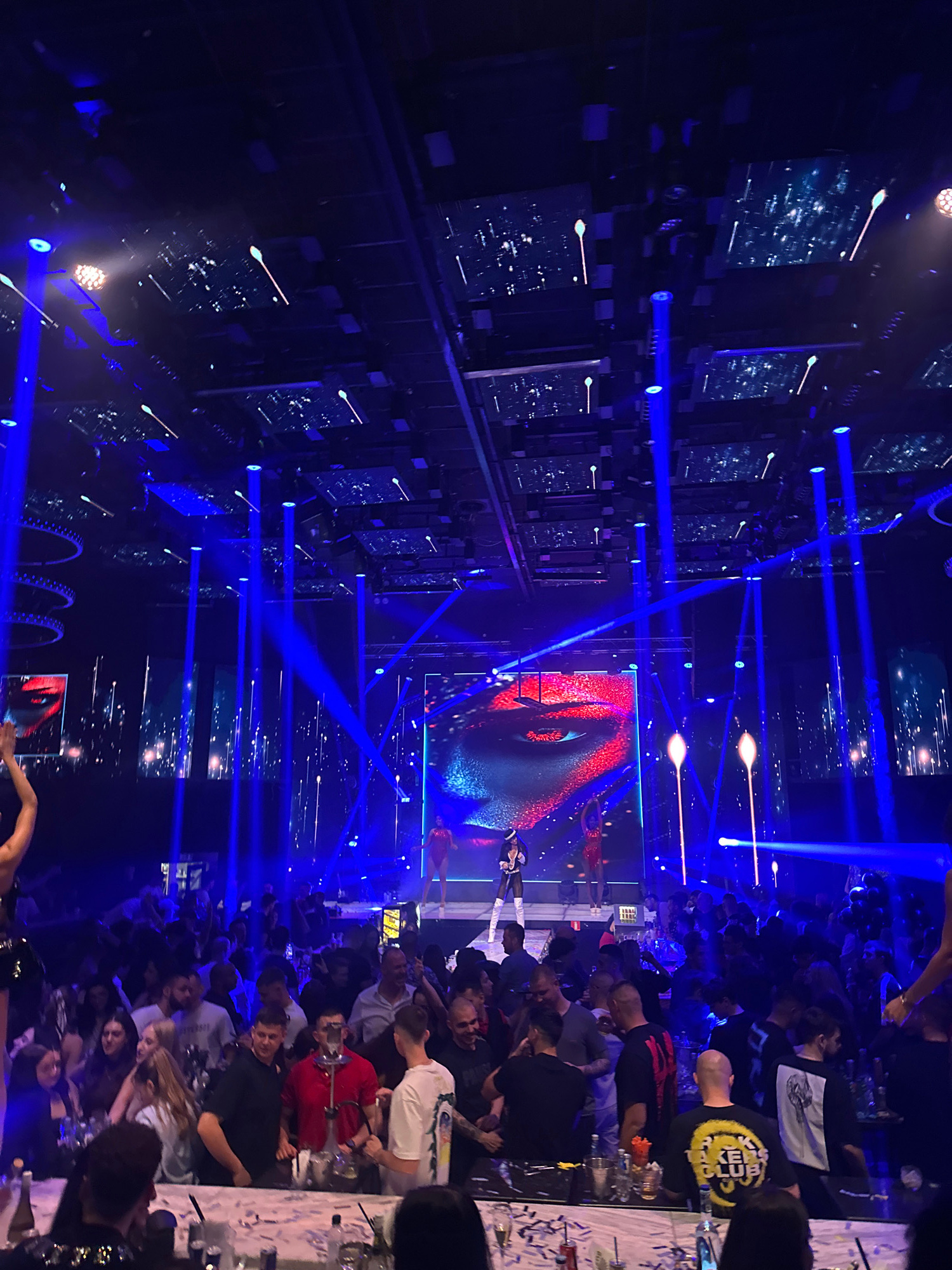 The image captures a vibrant nightclub scene. A densely packed crowd of people fills the space, many standing around tables, engaged in conversation and socializing. Dominating the background is a lar…read more
