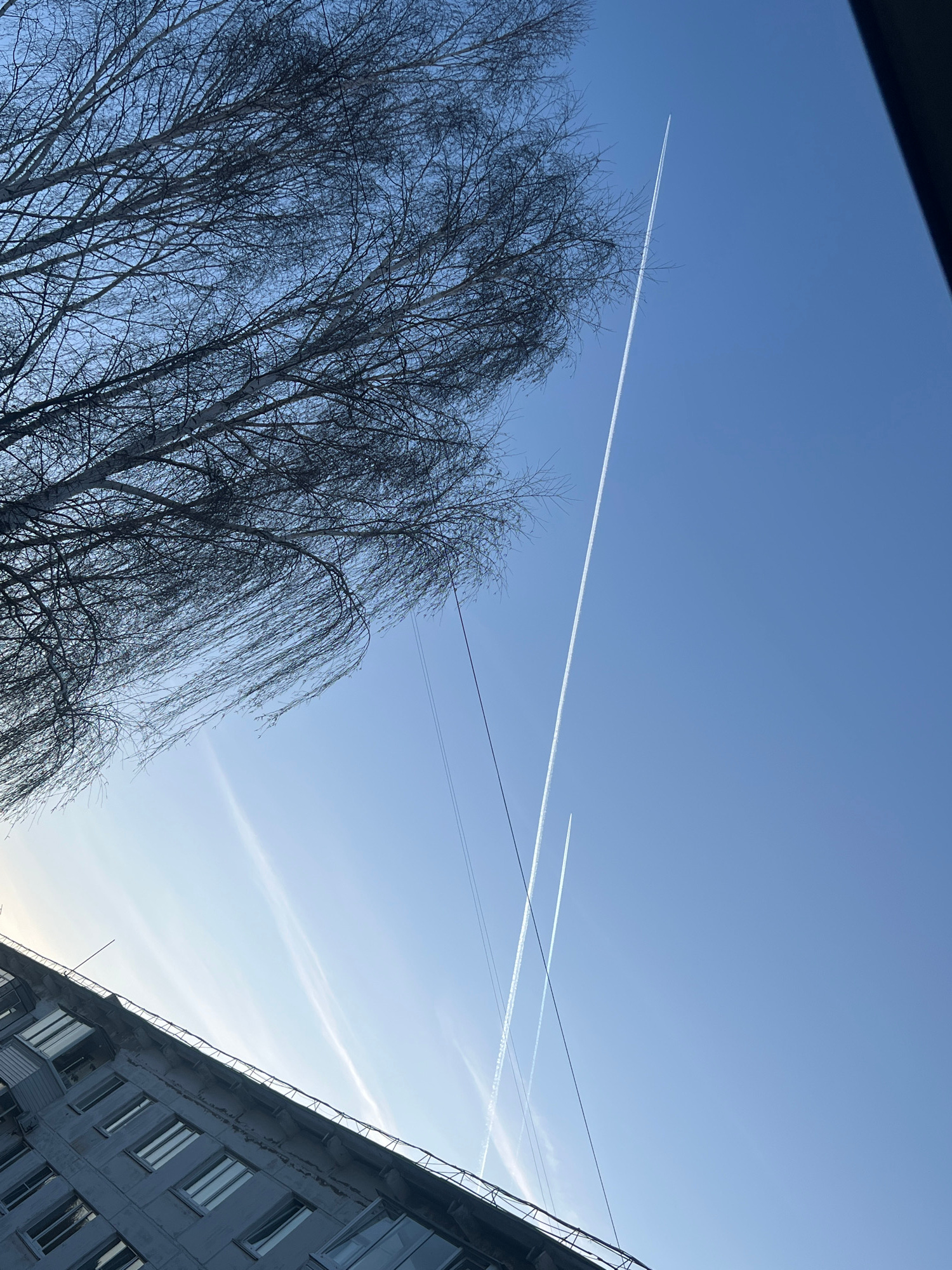 The image displays a clear, bright blue sky dominating the upper two-thirds of the frame, situated over Chaikovsky, Russia. Several white contrails from airplanes streak across the sky. A prominent, t…read more