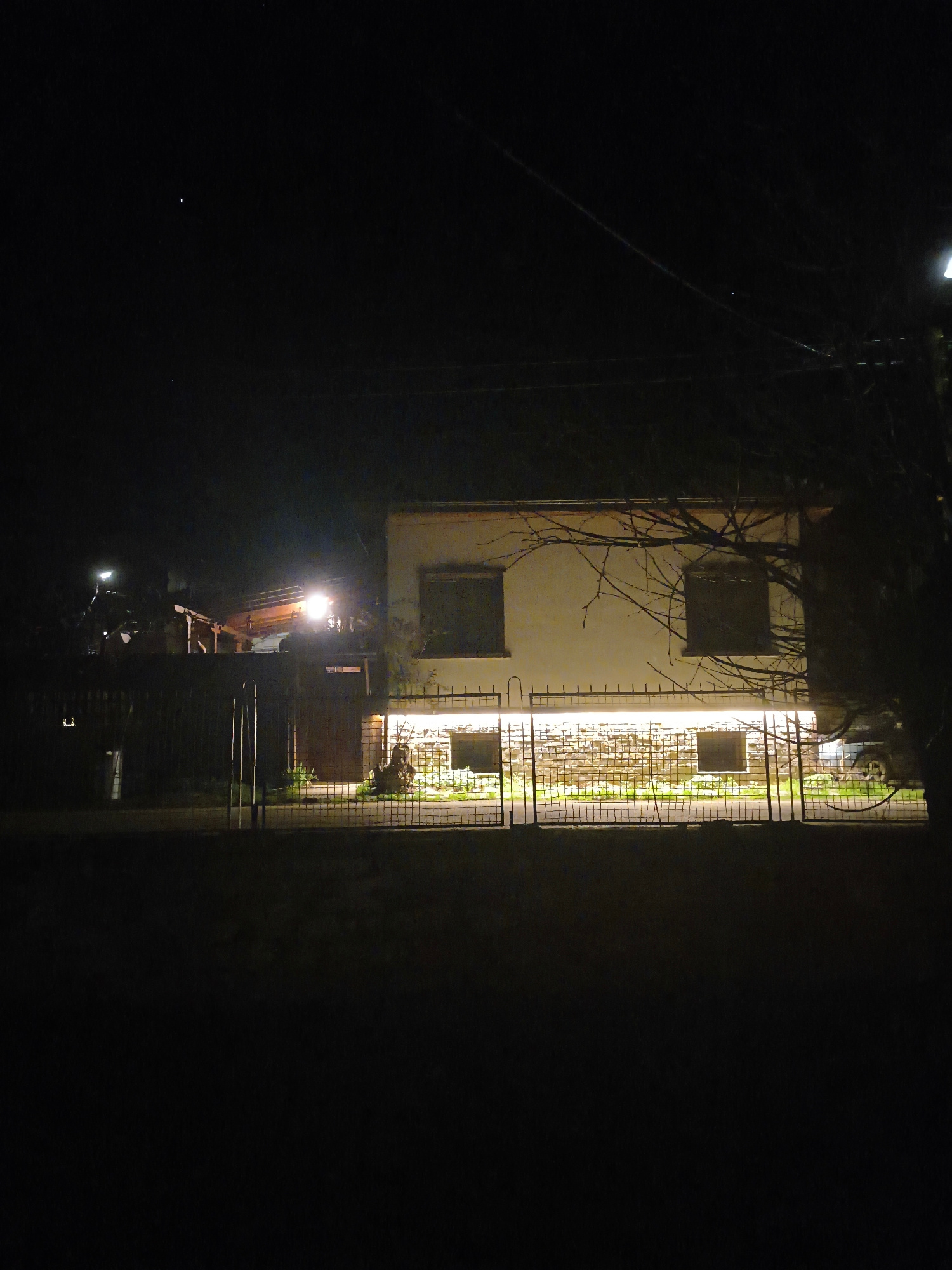 At night in Berkovitsa, Bulgaria, a two-story building is partially illuminated. The building has windows on both floors. A fence partially obscures the right side of the building and the ground level…read more