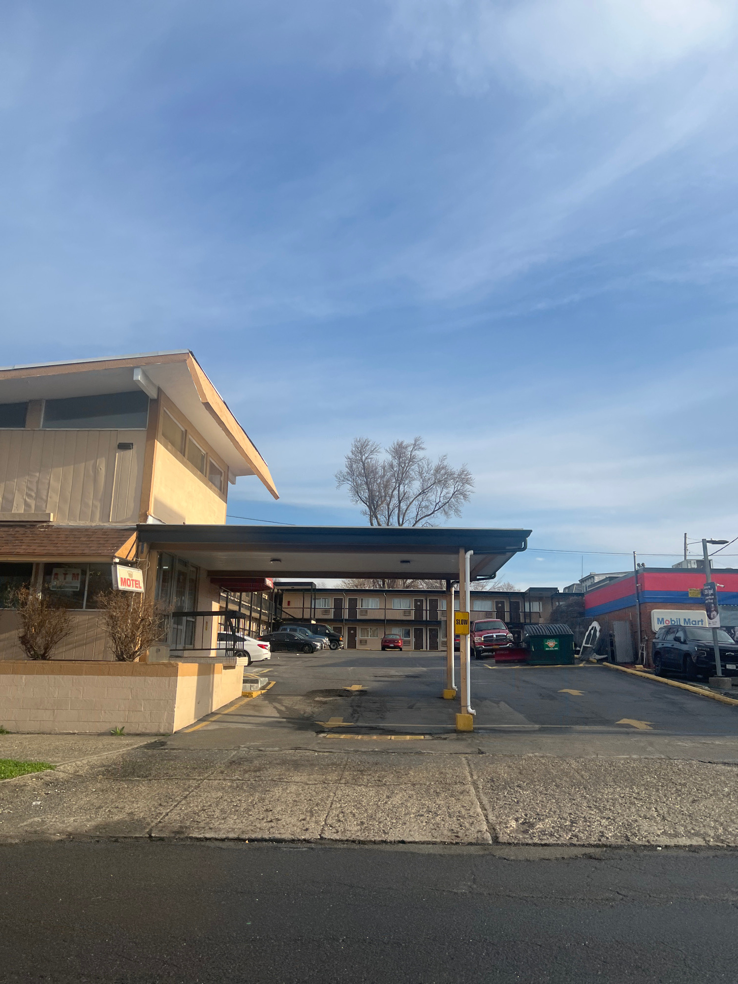 The image shows a motel in the City of Newburgh, United States of America. The motel is a two-story building with beige walls and a brown roof. There is a sign that says "MOTEL" on the front of the bu…read more
