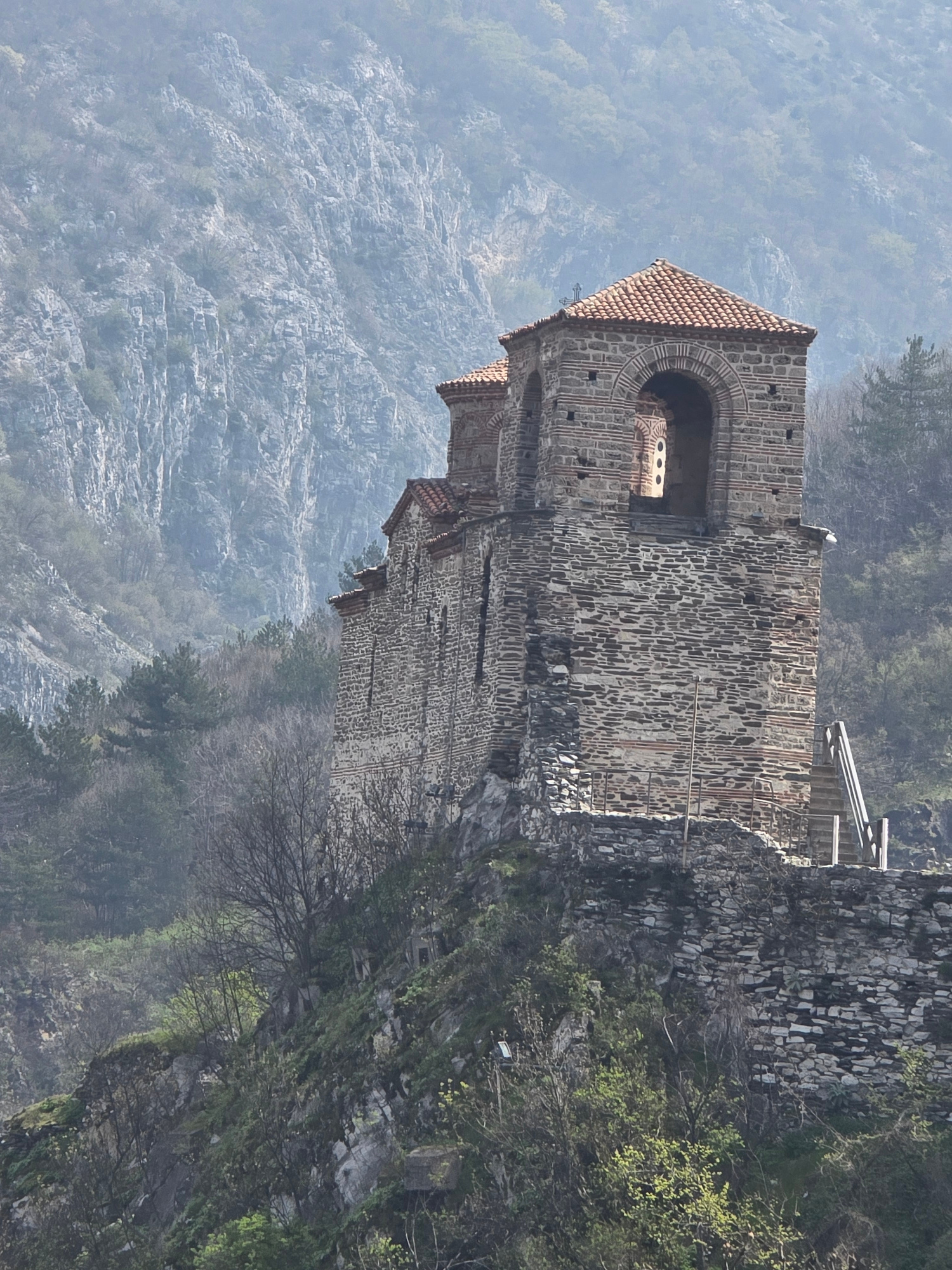 The image shows the Church of the Holy Mother of God of Petrich, located in Asenovgrad, Bulgaria. The church is perched on a cliffside overlooking a valley filled with trees and misty hills. The churc…read more