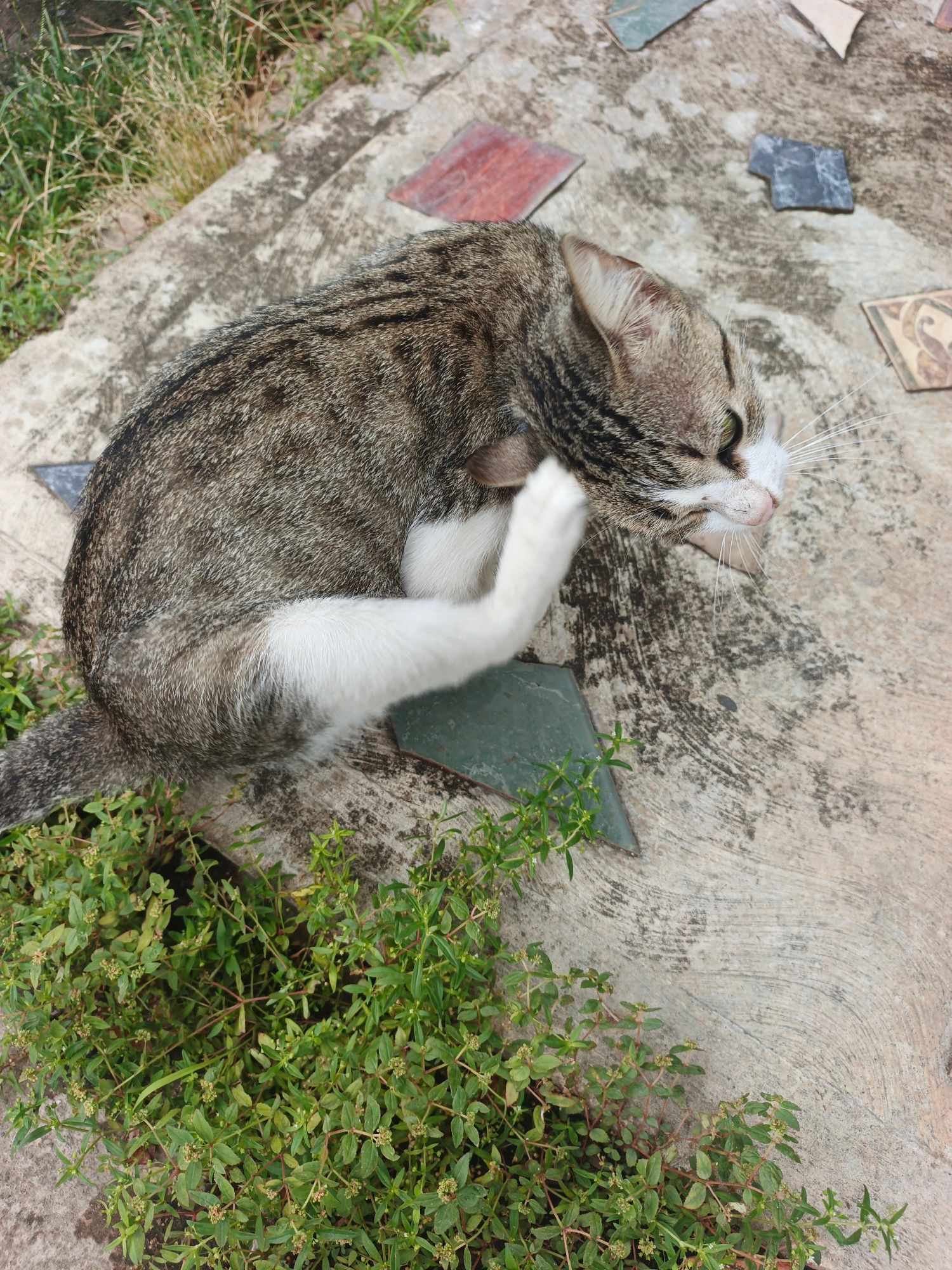 A domestic cat, predominantly a tabby with a mix of brown, grey, and black stripes and spots, is depicted lying on a concrete surface. The cat has a white underbelly, paws, and parts of its face, incl…read more