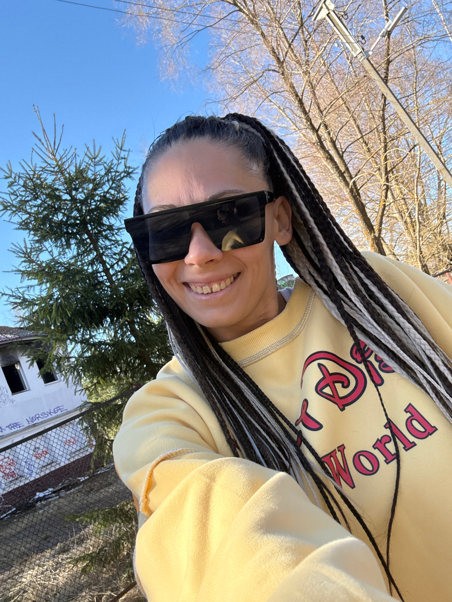 A woman is visible in a self-taken photograph (selfie), angled upwards towards the sky. She is wearing a yellow sweatshirt with red writing and a design, and her hair is styled in long black and whiteβ¦read more