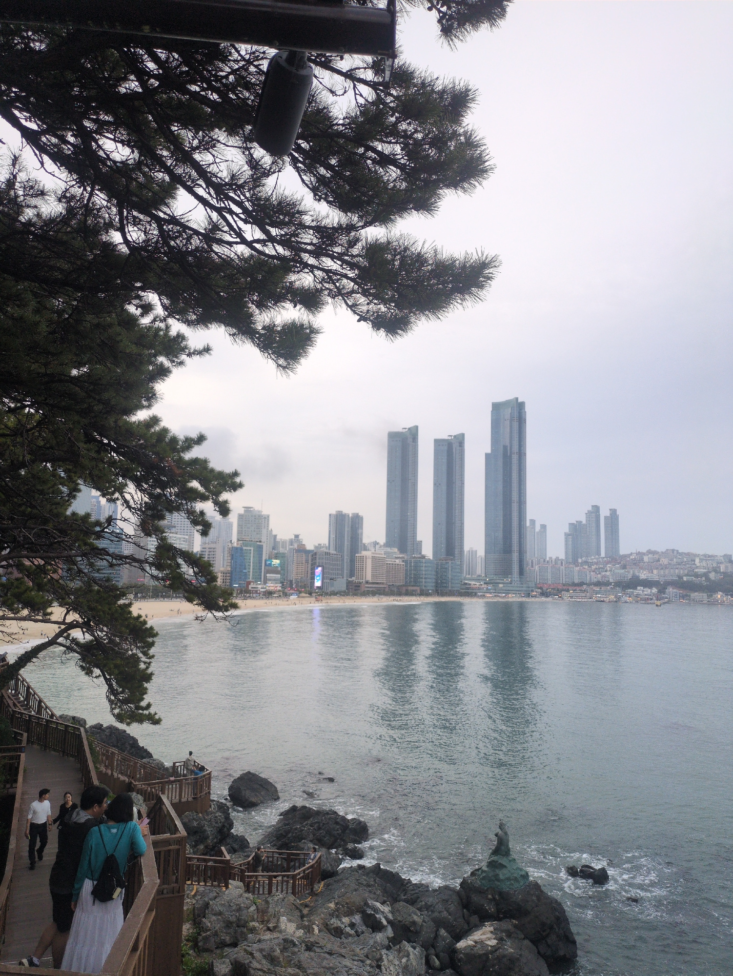 The image shows a view of Haeundae Beach in Busan, South Korea, from an elevated vantage point. The beach stretches along the coastline, backed by a dense cluster of tall buildings. The water is calm…read more