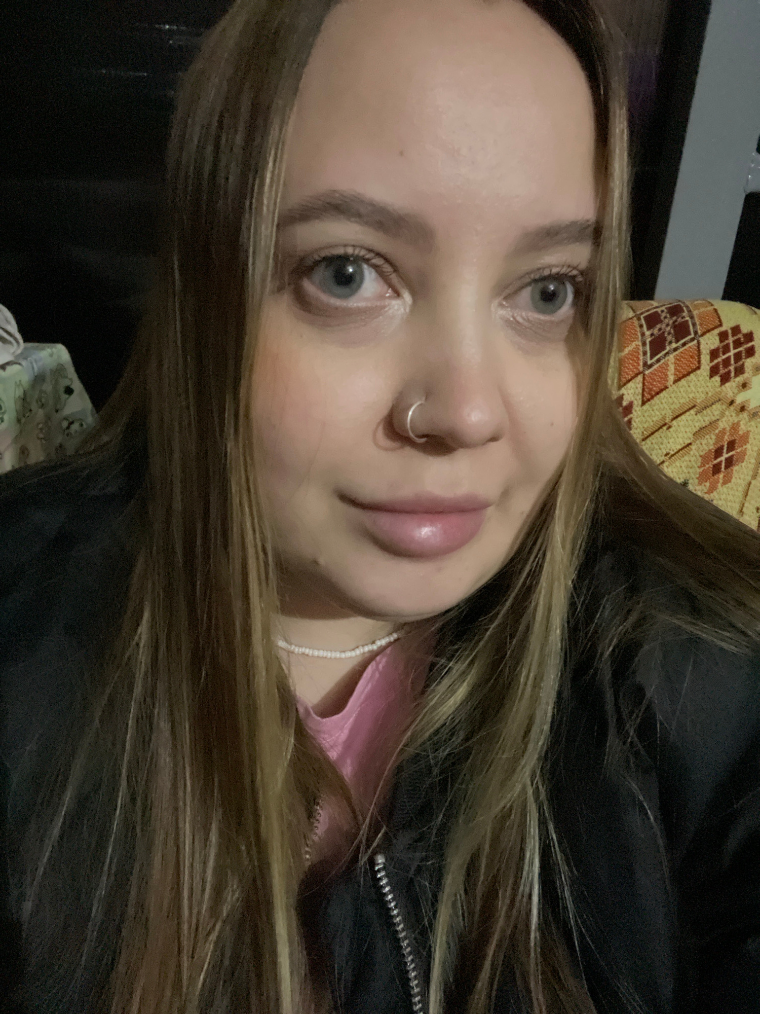 A young woman is taking a selfie. The woman has fair skin, long light brown hair, and light-colored eyes. She has a nose ring. She is wearing a pink shirt, a white beaded necklace, and a black jacket.…read more